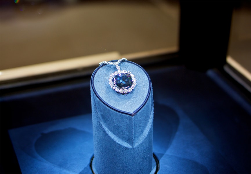 According to experts, the cost of a blue crystal is now $ 100 million. Anyone can see it. The necklace is protected from intruders by bullet-proof glass.