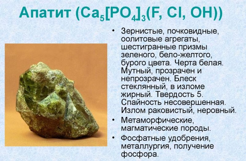 In Norway, minerals similar to malachite are often found, they are aquamarine, and a natural patterned pattern is seen inside. The largest Russian mineral deposit is located in the Murmansk region and it is called Khibinskoe, since the Khibiny Mountains are located nearby. By the way, there is a town nearby, which is called Apatity. In addition, active production of apatites is carried out in Buryatia (the Oshurkovskoye and Beloziminskoe deposits) and in Yakutia (the Neryanzhinskoye and Ulkhan-Melenkinskoe deposits). The main deposits of minerals are in rocks that have been formed since the eruptions of ancient volcanoes.