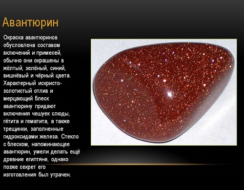 There are several plausible versions about the origin of the name of the stone. According to one of them, the origin of this semi-precious mineral can be associated with the Italian phrase per avventura, which translates as “accident”. According to legend, one glassmaker poured into the mass from which he was going to make glass, ordinary sawdust of copper, the product came out so unusual that a special name was invented for it. A little later, it became actively applied to the stone, which was very similar to this unique glass. Many claim that the stone could also get its melodious name from the word aventura, which in Italian translates as “happiness” or “fun adventure”.