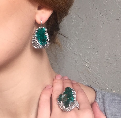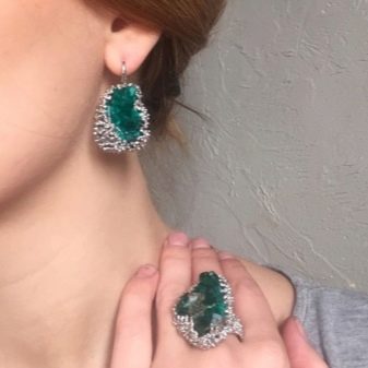 When cut, it often crumbles, breaks and does not withstand the effects of the jeweler's tools. Rings and earrings with small crystals are popular among lovers of delicate jewelry, sometimes exceeding the price of more refined precious items with pearls or natural emerald. Dioptase is often used in the form of powder: expensive decoration items, exclusive outfits are issued to them, and they are also included in the collections of precious stones.