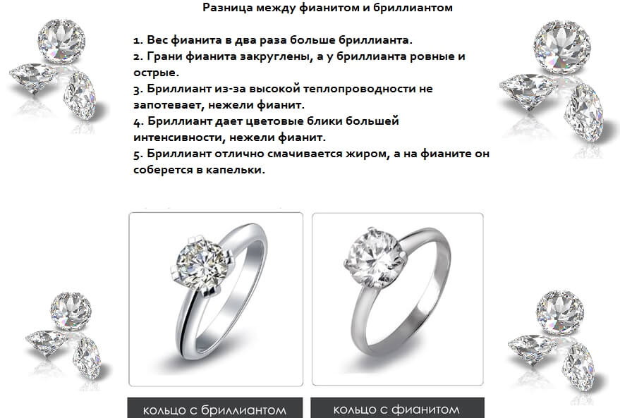 It is also easy to distinguish a natural diamond from cubic zirconia, and this can be done by a number of external signs. Thus, the edges of the cut of an artificial crystal are rather rounded, while the diamond cut has clear and sharp edges. Therefore, when holding a sharp edge on the mirror surface, the fianit will only slightly scratch it, while the diamond will simply cut it. Moreover, due to the increased density cubic zirconia is much heavier than diamond, and under the influence of ultraviolet rays it is less transparent than diamond.