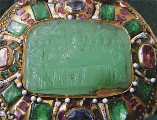Not inferior to the cities of Germany and Prague, where the walls and ceilings of chapels and cathedrals are decorated with many mosaics of the XIV century. It is from this time that chrysoprase begins to be widely used in many fields of art. Elegant mosaic compositions are found in the chapels of St. Catherine in Karlštejn. The famous Karlštejn mosaic looks like a magic carpet. In Prague Castle, the St. Wenceslas Chapel also has superb rare mosaic coatings.