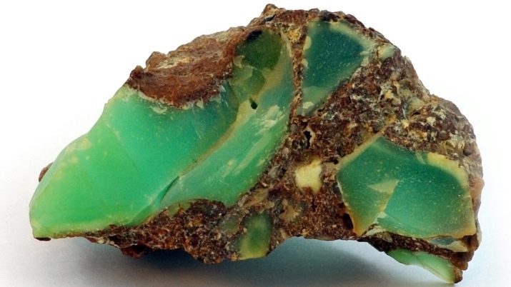 The mineral is a cryptocrystalline water-containing form of silicon dioxide, including some nickel. It is this compound that determines its coloring. The stone may contain impurities of opal and individual inclusions of talc and serpentine. The fragile shoots of dendrites formed by manganese oxides are often contained. Characteristics of the stone: