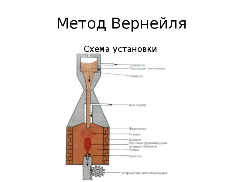 - Verneuil Method. Powdered aluminum trioxide is mixed with chromium. Then the mixture is melted in small portions on the burner. Next, cylindrical single crystals (boules) with a diameter of 2 and a length of up to 30 cm are formed on a ceramic lining.
