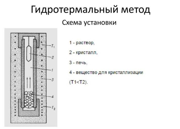 - Hydrothermal synthesis method. The process of crystallization of the mineral is carried out in solutions of low-melting compounds (lead, boron and other elements).