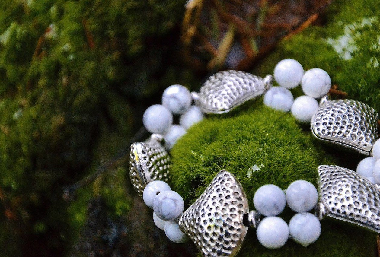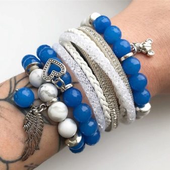 The white cacholong bracelet with dark veins fascinates with its appearance. Women who value gems will be delighted to replenish the collection with such an interesting thing.