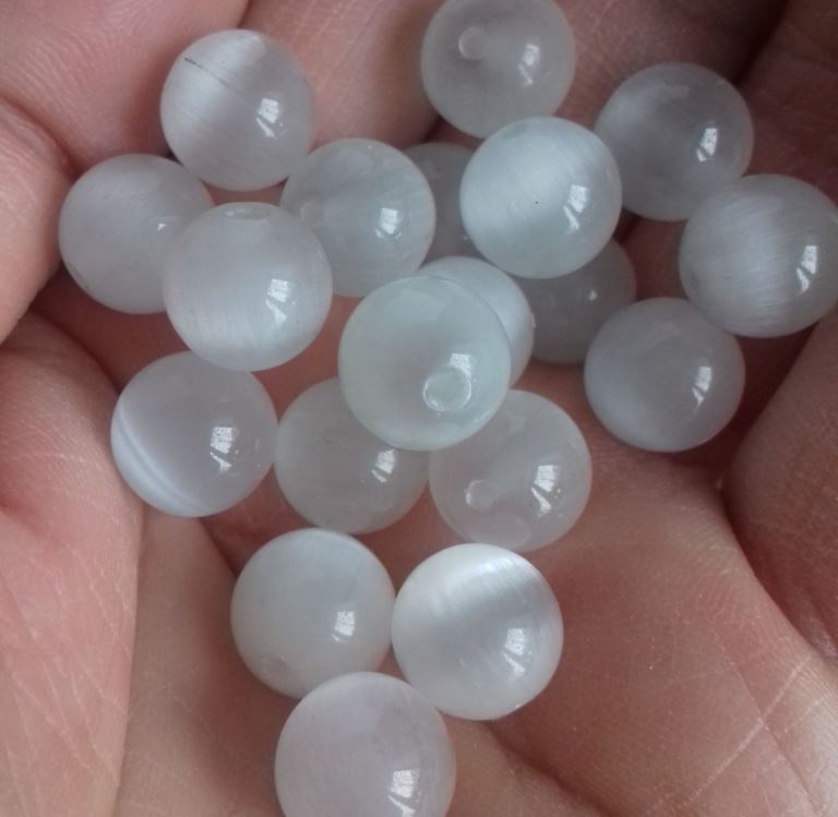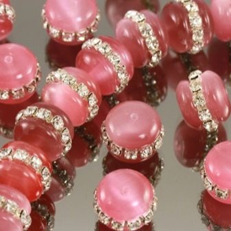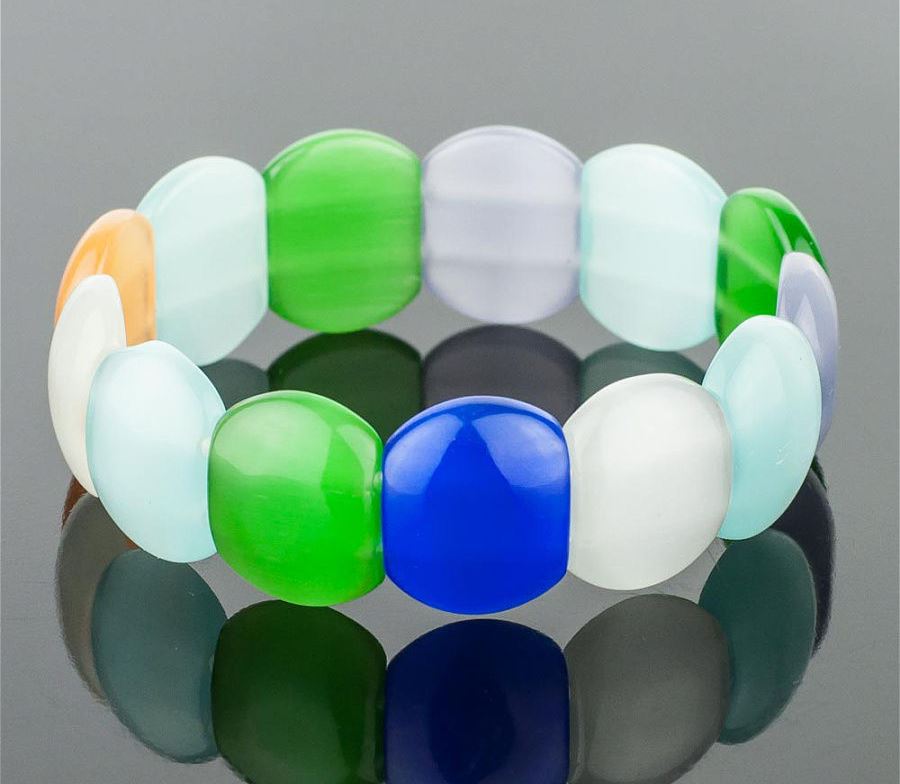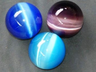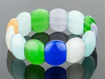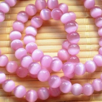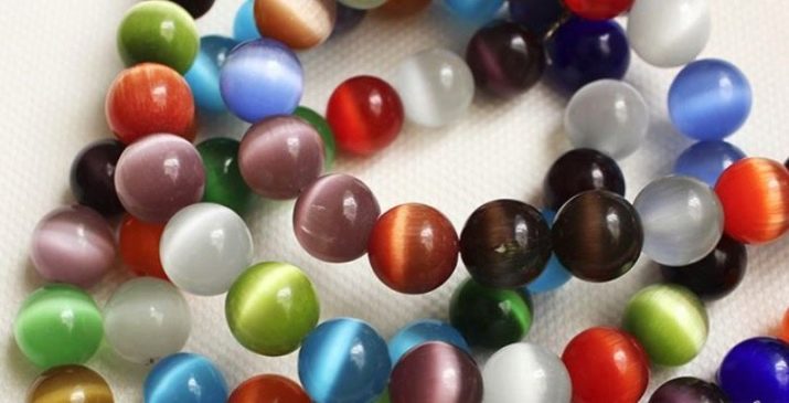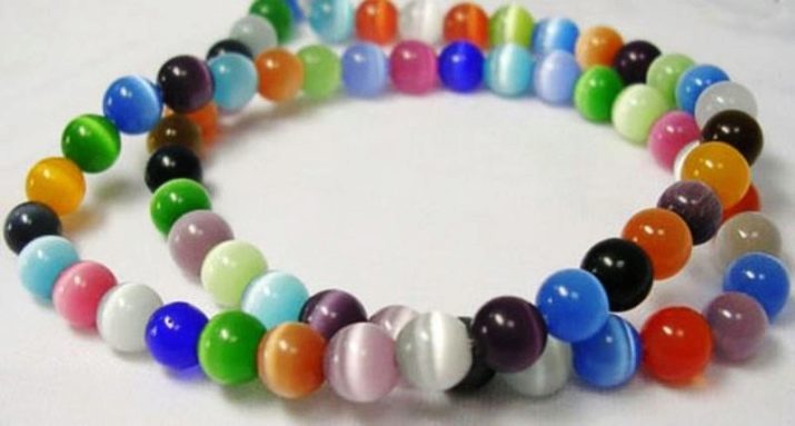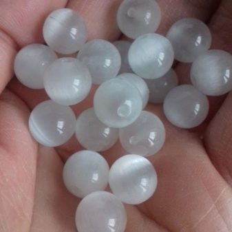- Artificial or natural ulexite (boronatrocalcite). When properly polished, the mineral looks like a cat's eye. Due to the easy colourability, the artificial stone can be of different colors. It is easily scratched, fragile, so it is used only as an insert in bracelets and rings. For the manufacture of beads, it is not suitable.