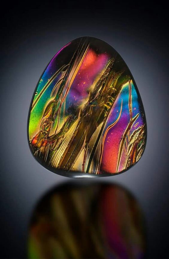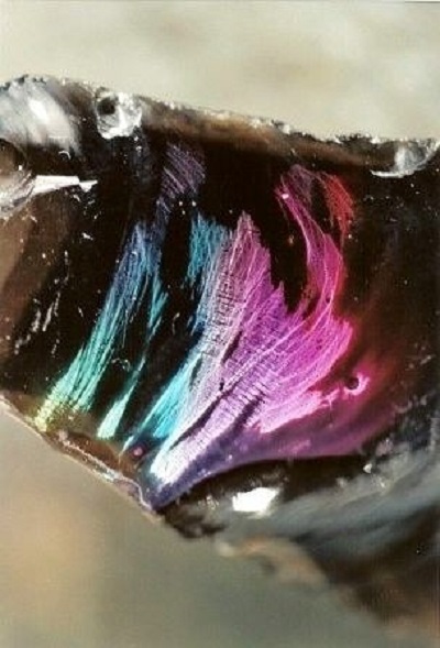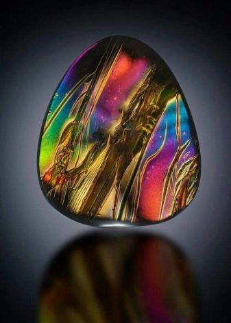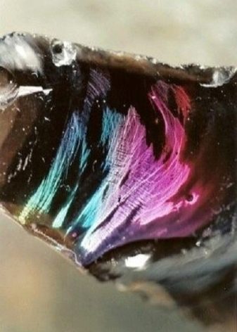 - Rainbow stone It is found in nature very rarely and therefore extremely valued. The palette of its color shades surprises with its variety. The mineral is a variety of black obsidian and includes several subspecies. In the process of natural lighting with intense sunlight and after a long natural polishing, the stone acquires luminous colored stripes and a bright play of colors: red and green, blue and golden, which are combined in different instances in different ways.