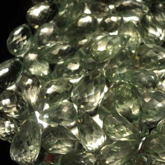 This stone belongs to the family of quartz, which also includes golden citrine, mountainous colorless crystal, smoky quartz and amethyst. Prasiolite has a green tint, reminiscent of young onions. The stone is transparent or translucent. Mohs hardness is 7, although it is quite fragile. The shape of the crystals is a hexagonal prism. The fracture has a shell shape. This mineral is much cheaper than tourmaline, peridot and beryl, therefore it is often used to imitate them. Prasiolite is sometimes called green amethyst.