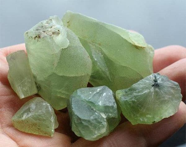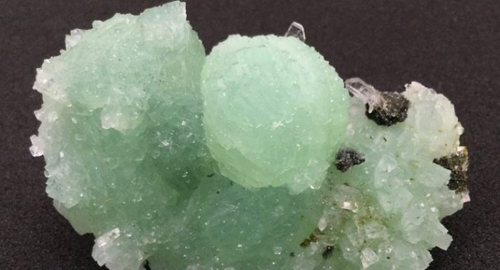 Prehenite refers to silicates - these are minerals that contain silicon dioxide (the compound of this substance with oxygen). This stone is quite hard, but differs by plasticity and brittleness. For example, it does not tolerate the neighborhood of open fire and high temperatures - it begins to melt from their effects. You should also avoid hitting the mineral with hydrochloric acid, otherwise the mineral will disintegrate.