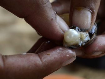 After 9 months, a ripe pearl of about a centimeter in size is extracted from the mollusk.