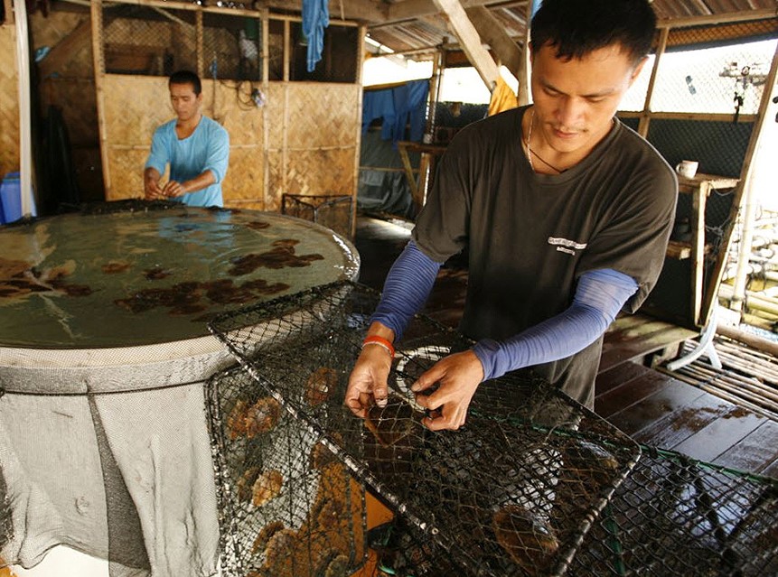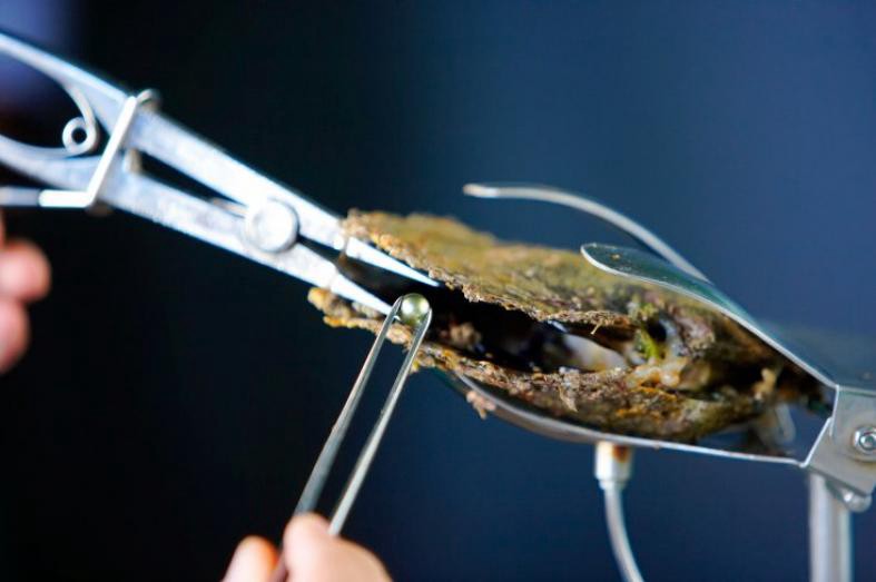 Upon reaching the size of the valves about 5 centimeters, several small crystals of quartz sand are implanted into the body of the mollusks and sent back to the cages to ripen the artificial jewel.