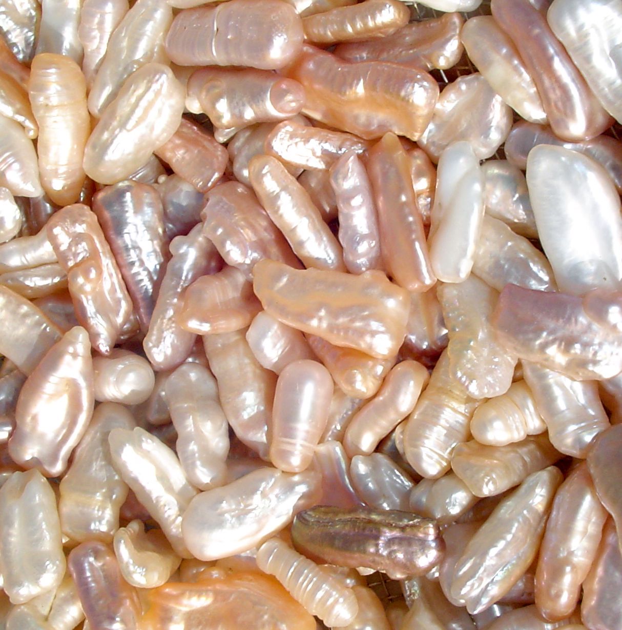 Pearls differ in shape, size and color. The mother of pearl bead, which grew out of a grain of quartz in Thailand, is white, black, pink and golden yellow.