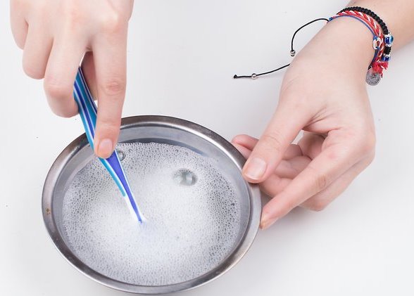 - Quickly and effectively at home you can return the shine with the help of a soap solution. Add water to a small container, add fragrance-free soap to it (liquid or soak solid, one spoon per liter of water is enough) and lower the products into the solution for a few minutes. After the procedure, remove moisture and soap residues with a soft, lint-free cloth. You can also use cotton pads.