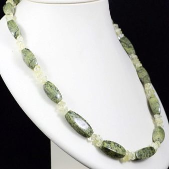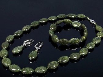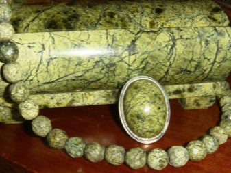 Attractive serpentine can be cut into pieces of various shapes. Most often it is cut into cabochons and beads. Such products do not have a uniform green hue, they show green, yellow and black inclusions.