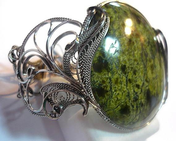 However, serpentine has some problems with durability. That is why the stone is rarely found in rings or bracelets, since one good blow can split it. Most often it is used in earrings, brooches or pendants.