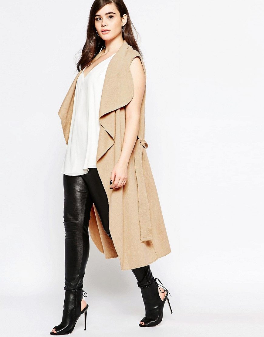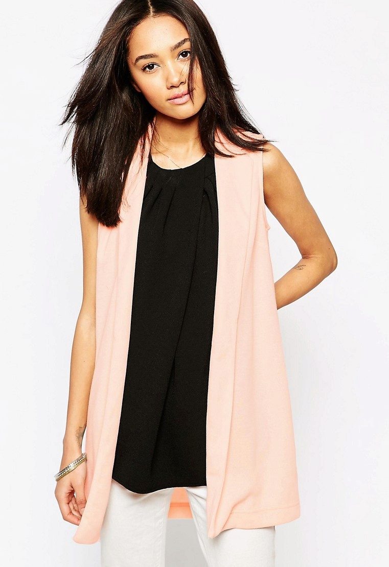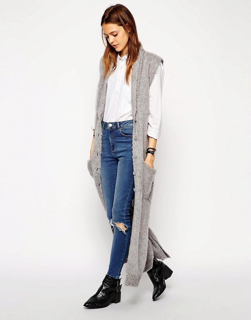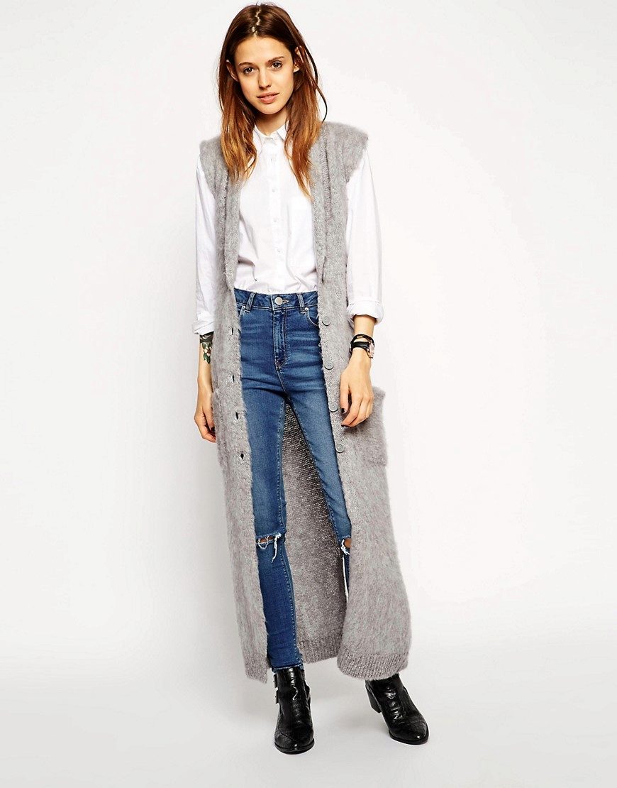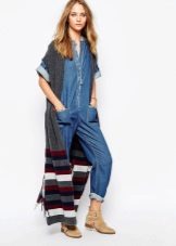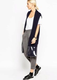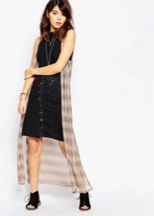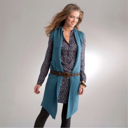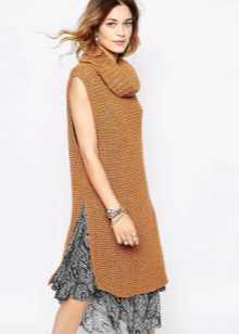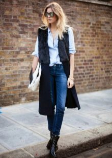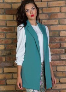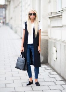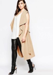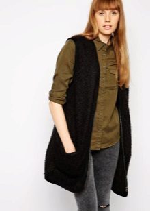 An extended model of a cardigan-sleeveless should be a must-have thing in the wardrobe of every girl who has a couple of extra kilos. Due to its length, it will perfectly hide such problem areas as the buttocks and thighs, and a correctly chosen color or print can change your silhouette beyond recognition, visually stretching it out and making it more slender.