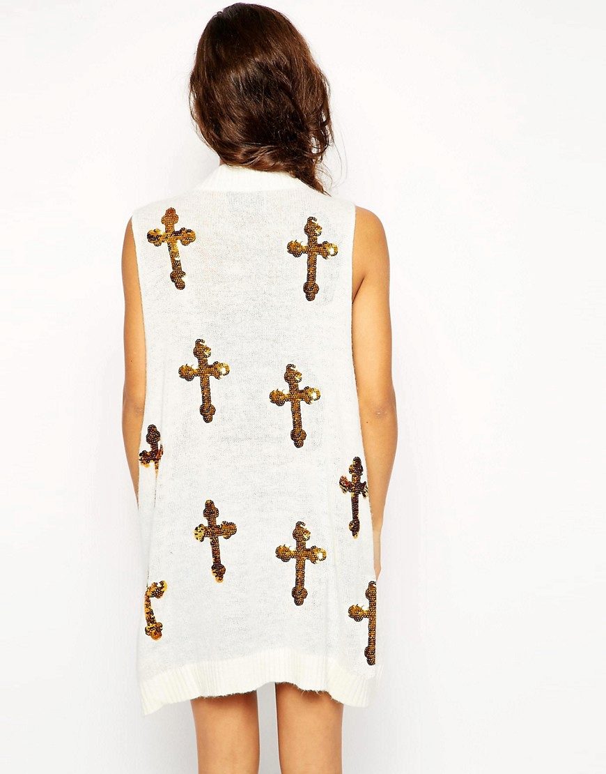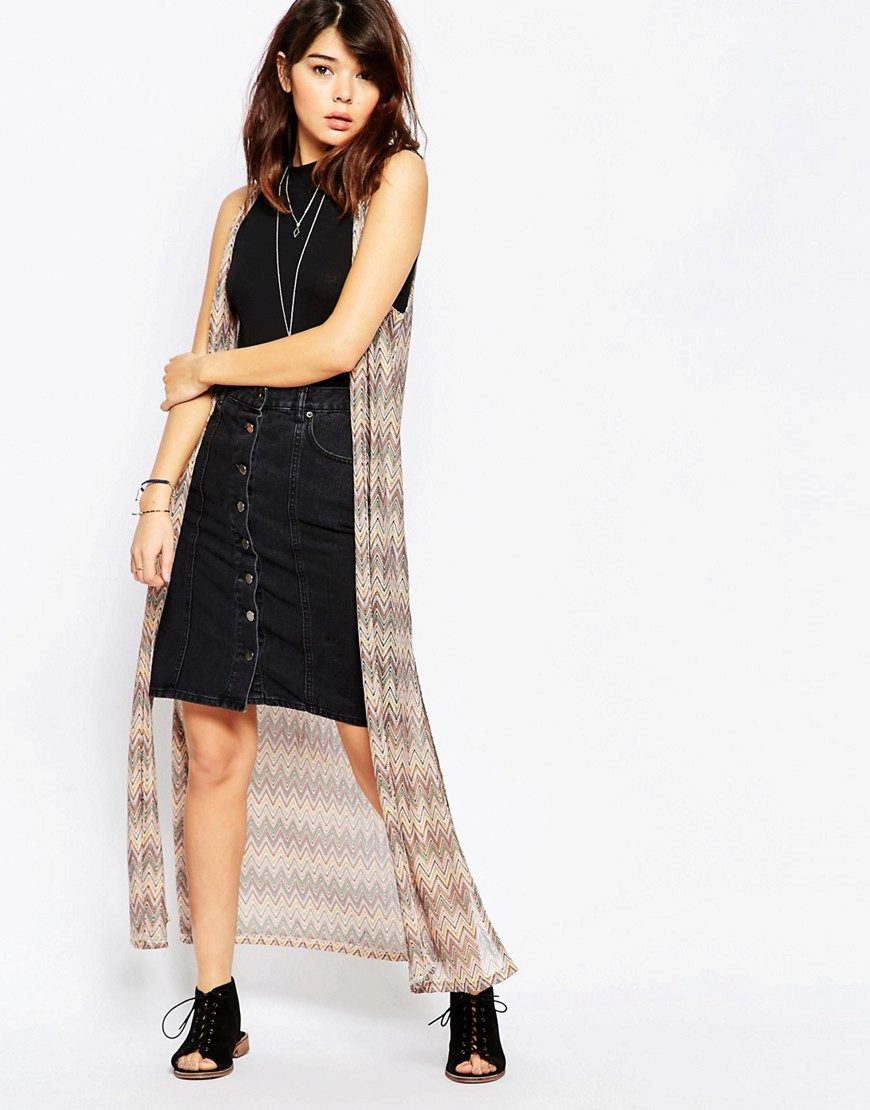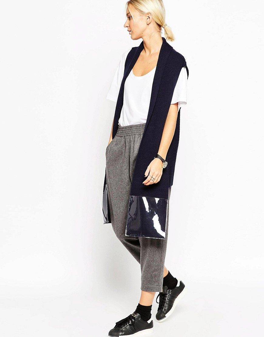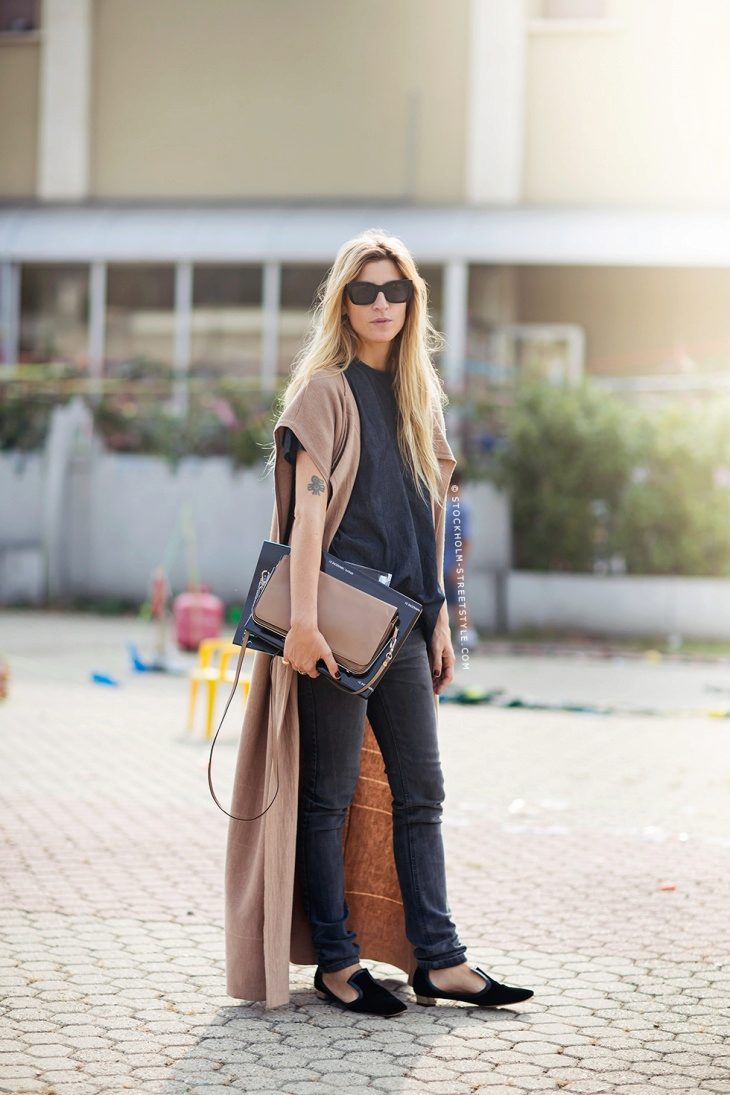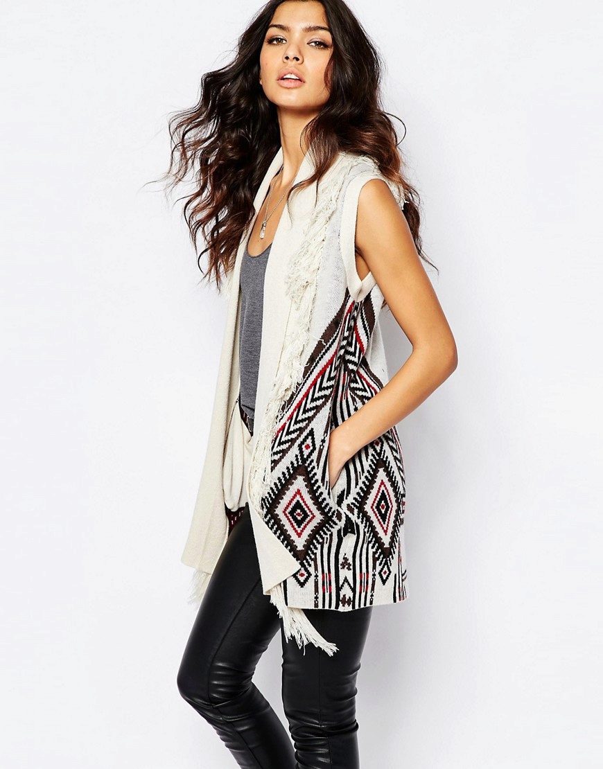 An extended model of a cardigan-sleeveless should be a must-have thing in the wardrobe of every girl who has a couple of extra kilos. Due to its length, it will perfectly hide such problem areas as the buttocks and thighs, and a correctly chosen color or print can change your silhouette beyond recognition, visually stretching it out and making it more slender.