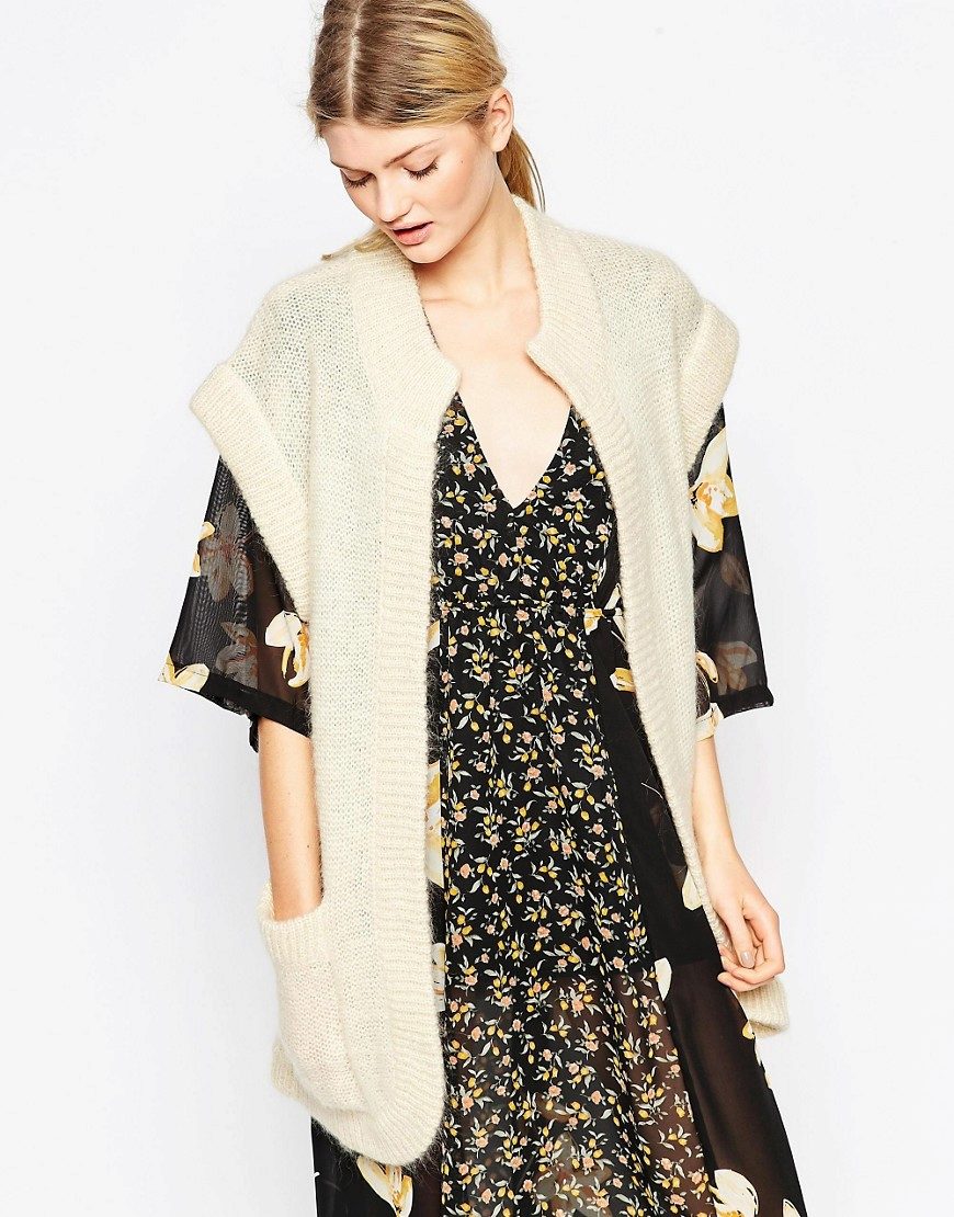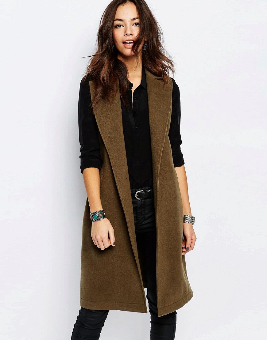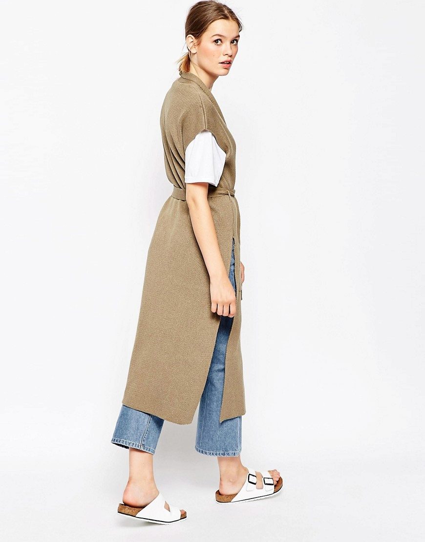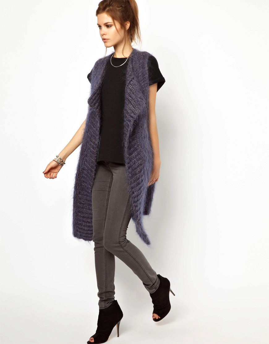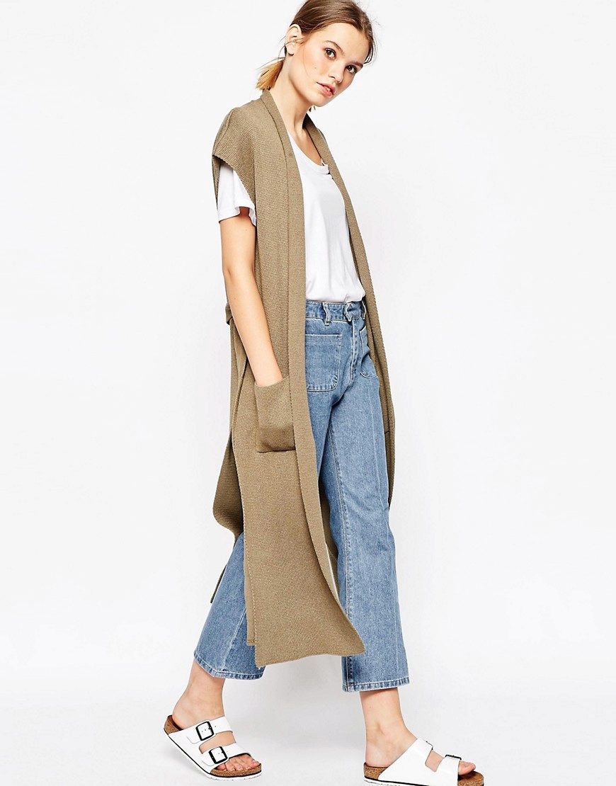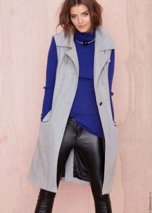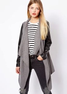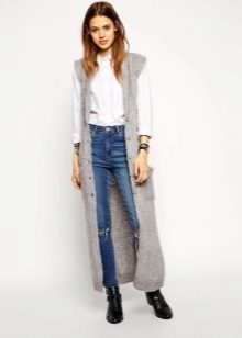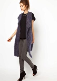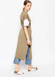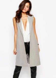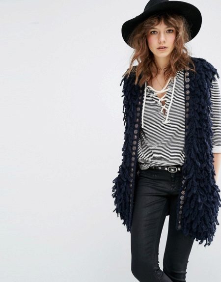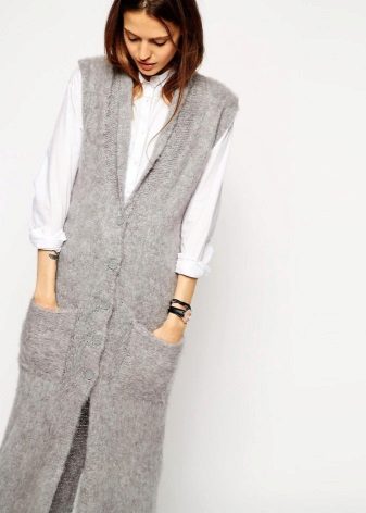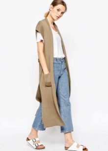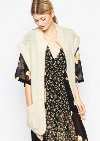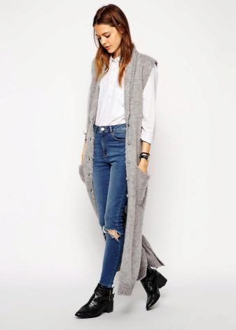 A cardigan with a smell, but without sleeves, can be an excellent option to attend fun activities with lots of people. It can perfectly complement almost any image, successfully fitting into a variety of ensembles. Often there is no fastener on such a model, therefore the provided belt or thin strap is an accessory that acts both as a functional and as a decorative element.