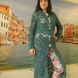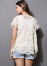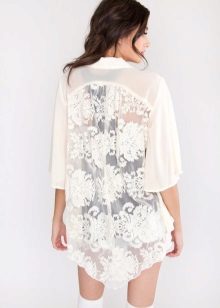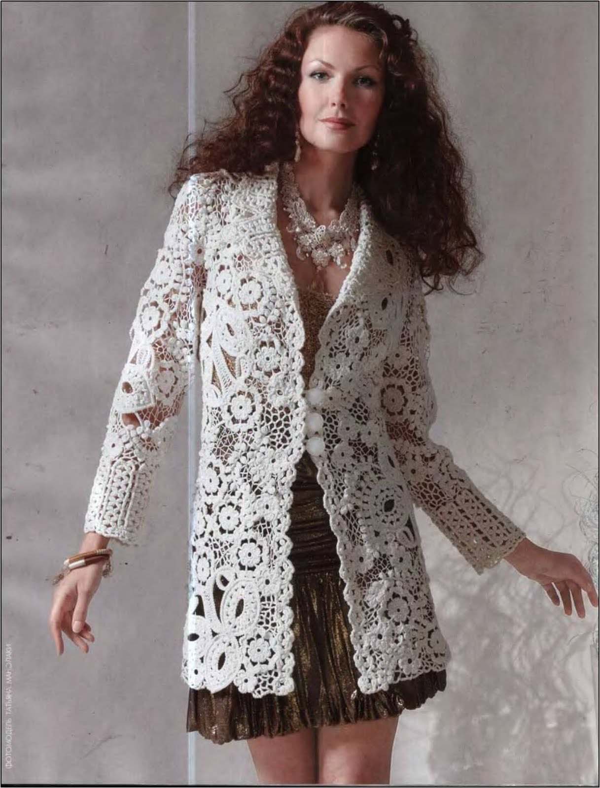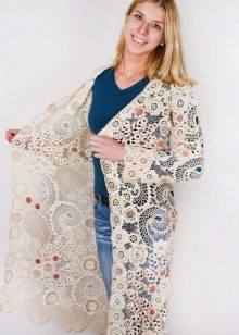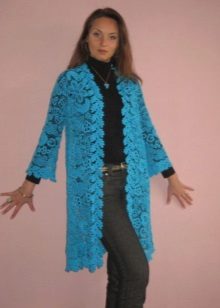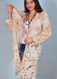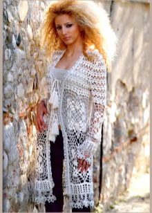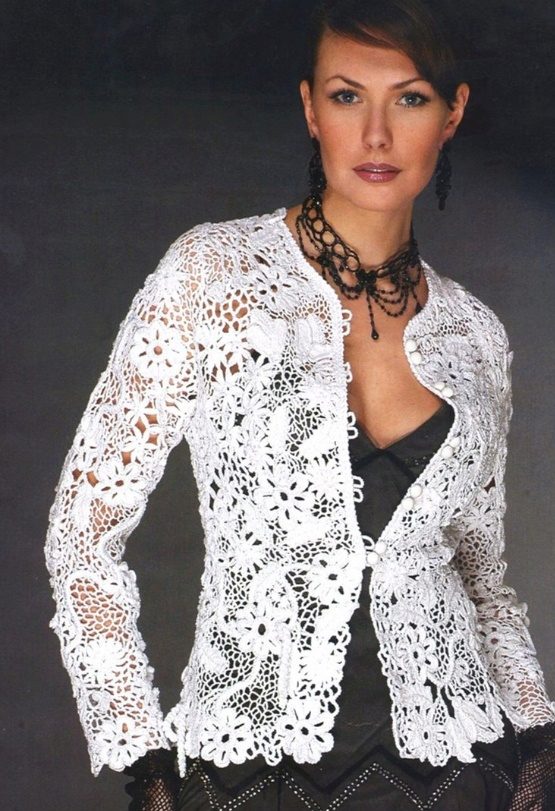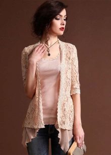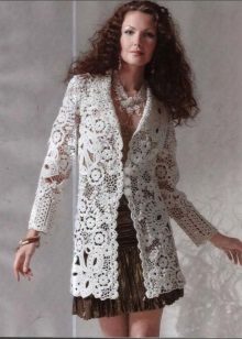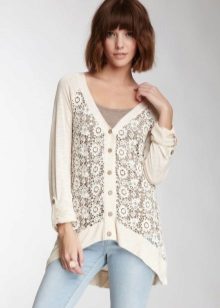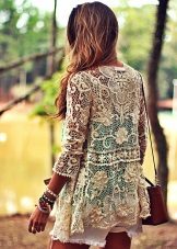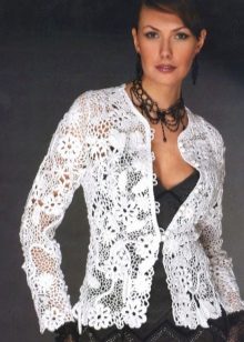 Cardigans, made in the technique of "Irladnd lace" are most often used as an element of elegant, festive clothing. They can be additionally decorated with pearls or rhinestones. It is interesting to look at combinations of several fabrics, for example, lace and transparent gas.