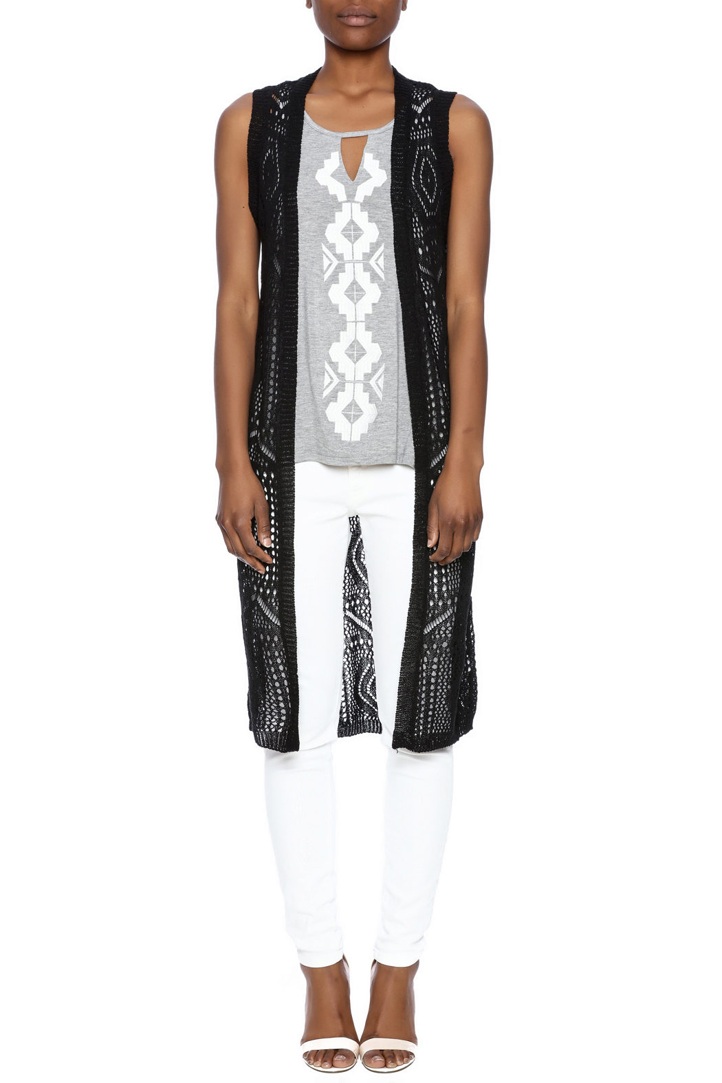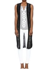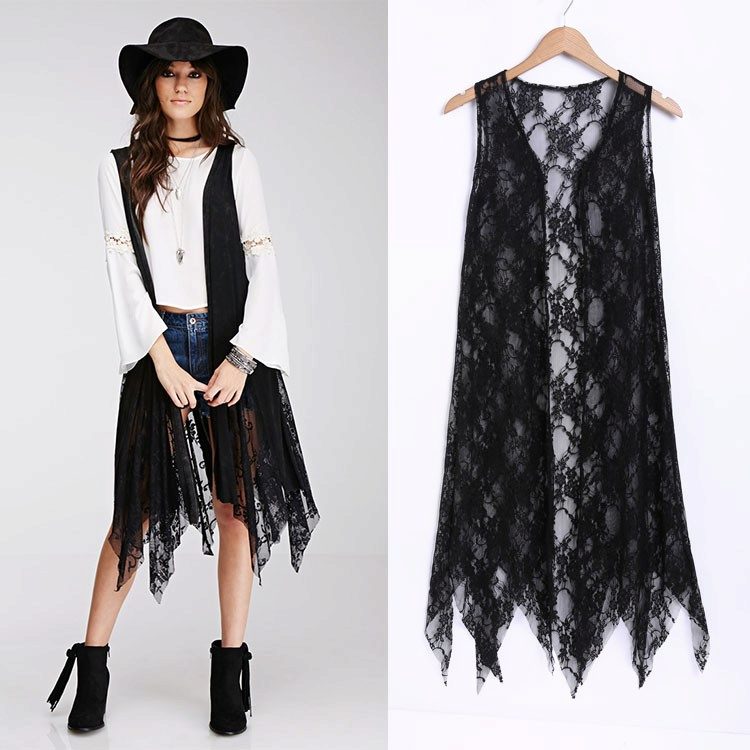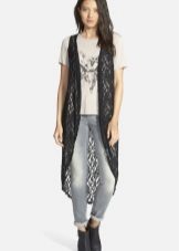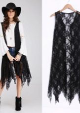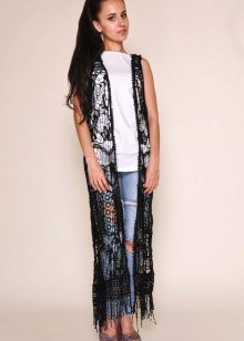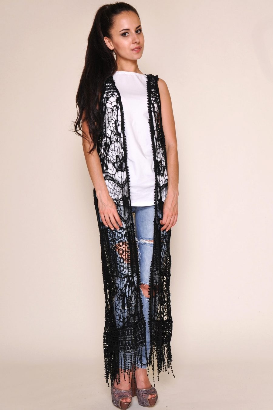 One of the most popular models is a long sleeveless lace cardigan. Such models are most often made of very thin, lace lace and resemble a beautiful, airy cape.