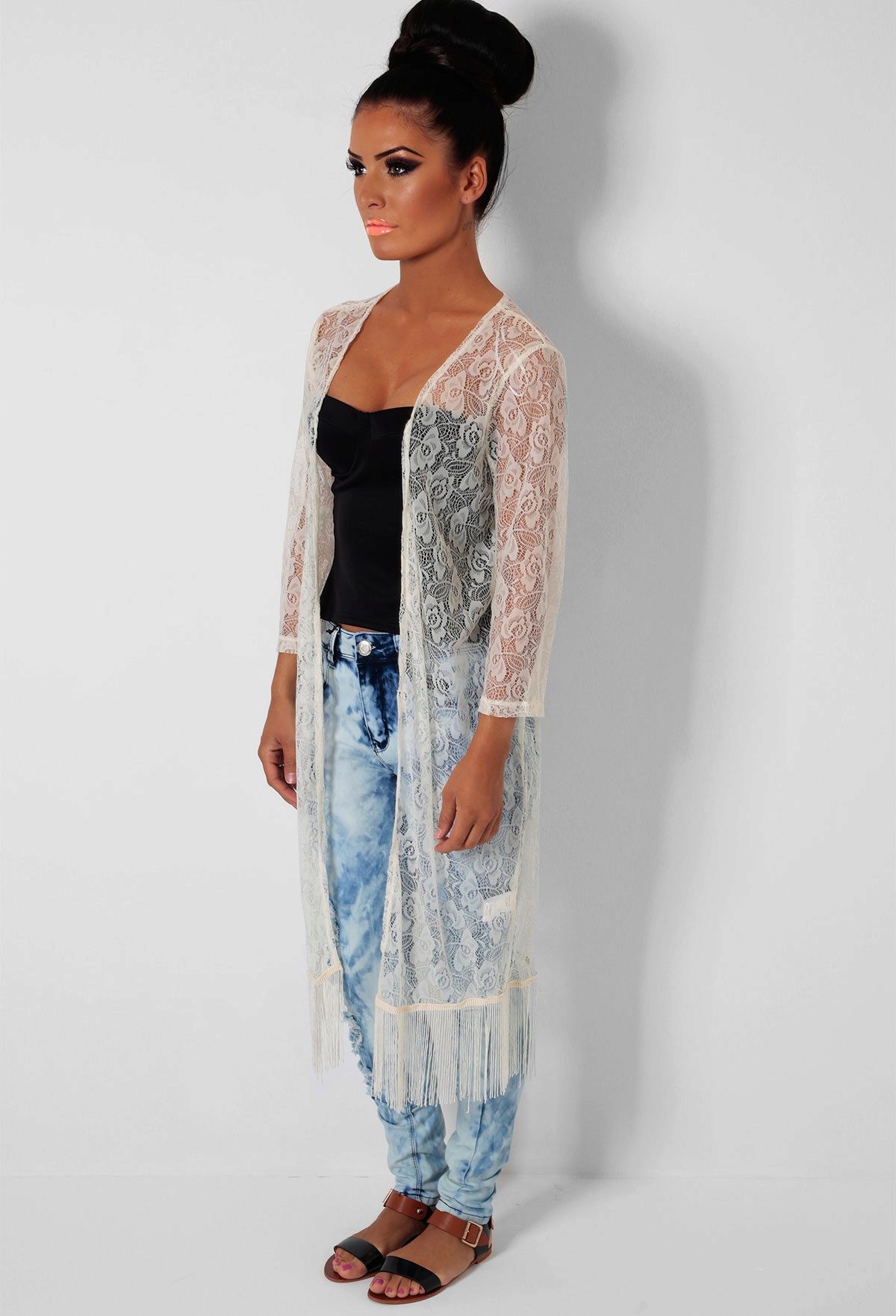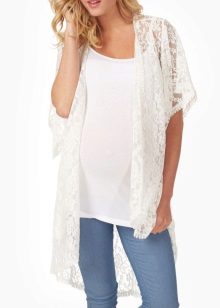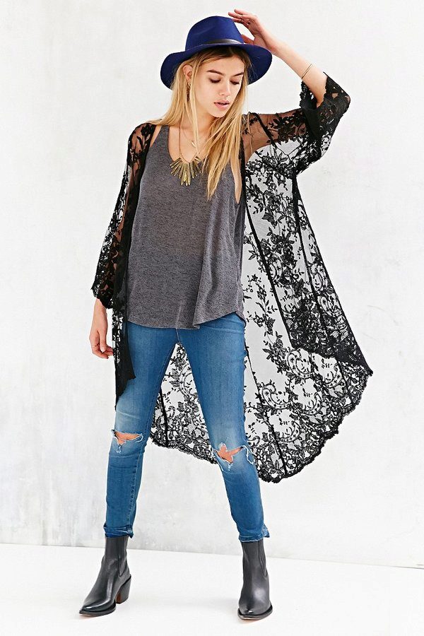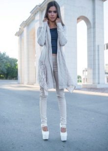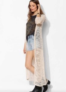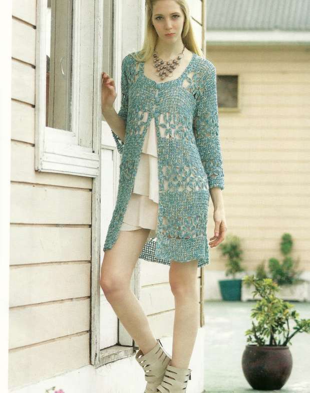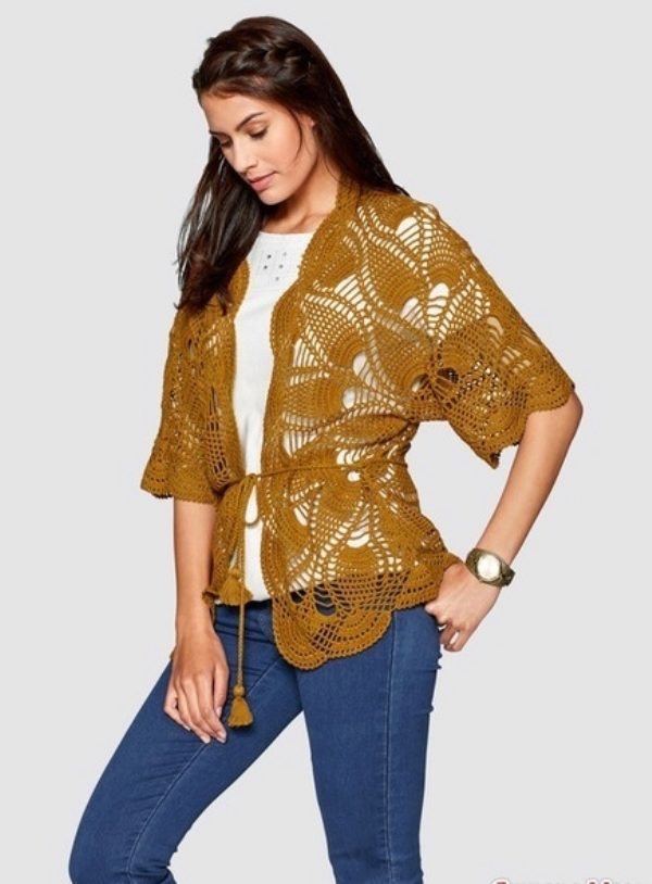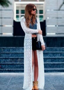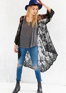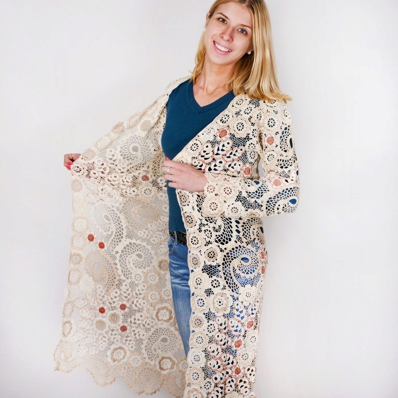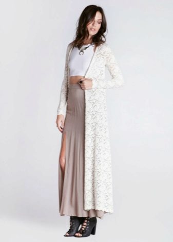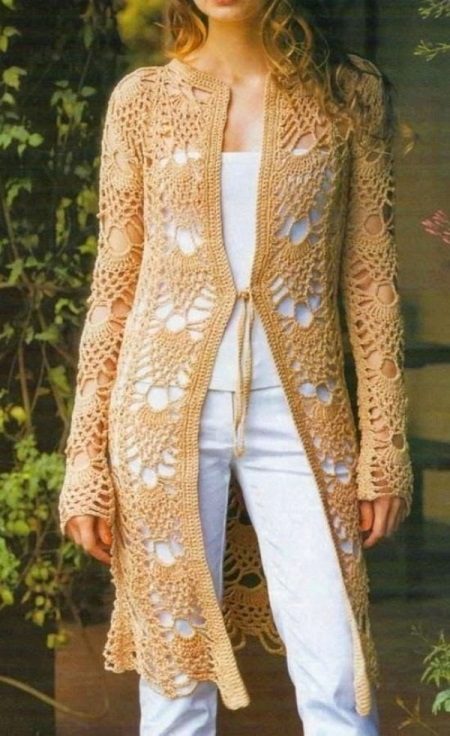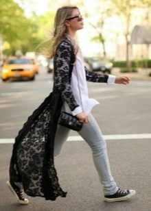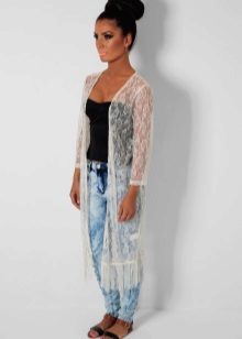 A classic mid-length cardigan made of thick lace can be worn with narrow, skinny jeans or pants.