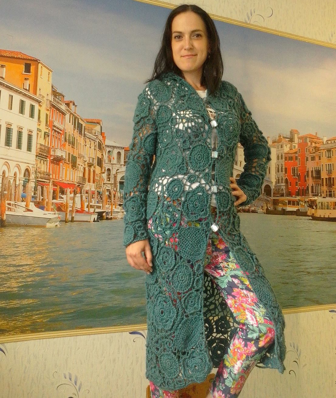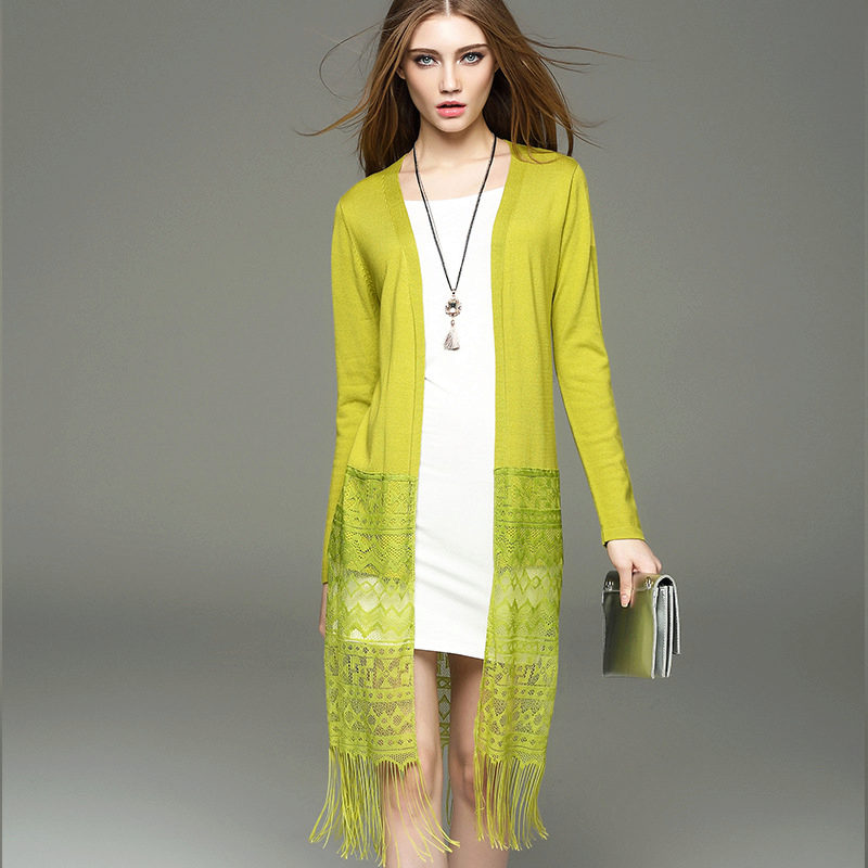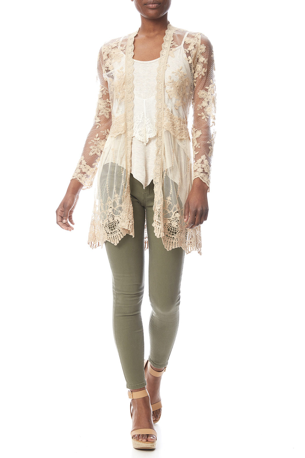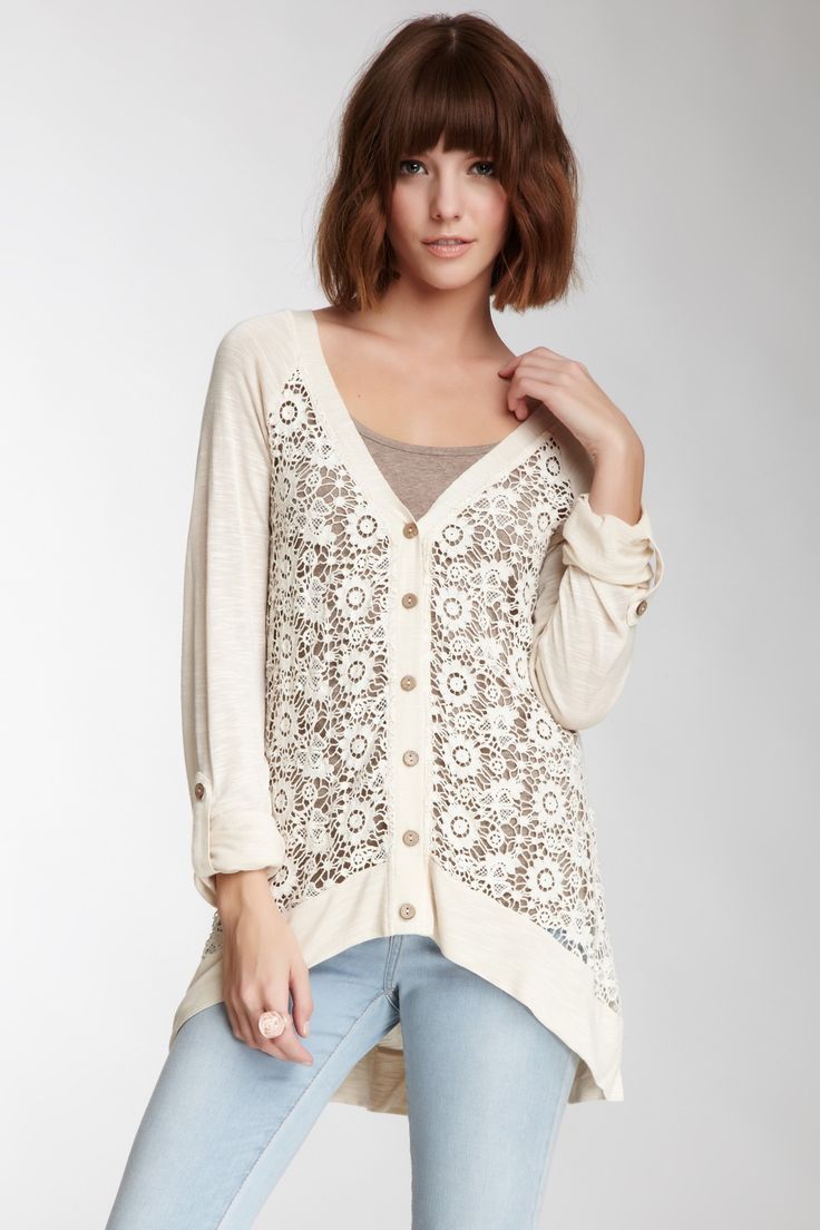A classic mid-length cardigan made of thick lace can be worn with narrow, skinny jeans or pants.