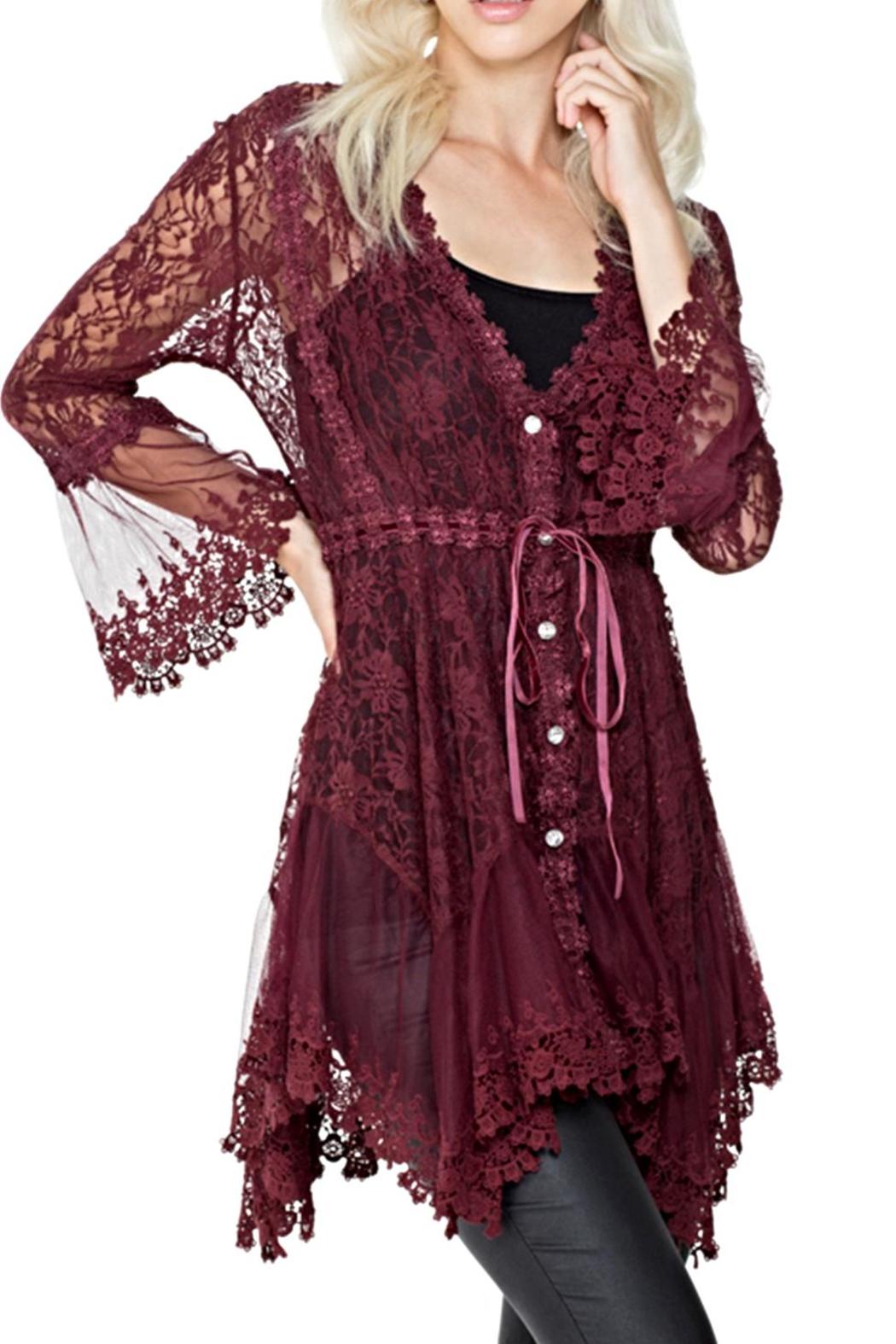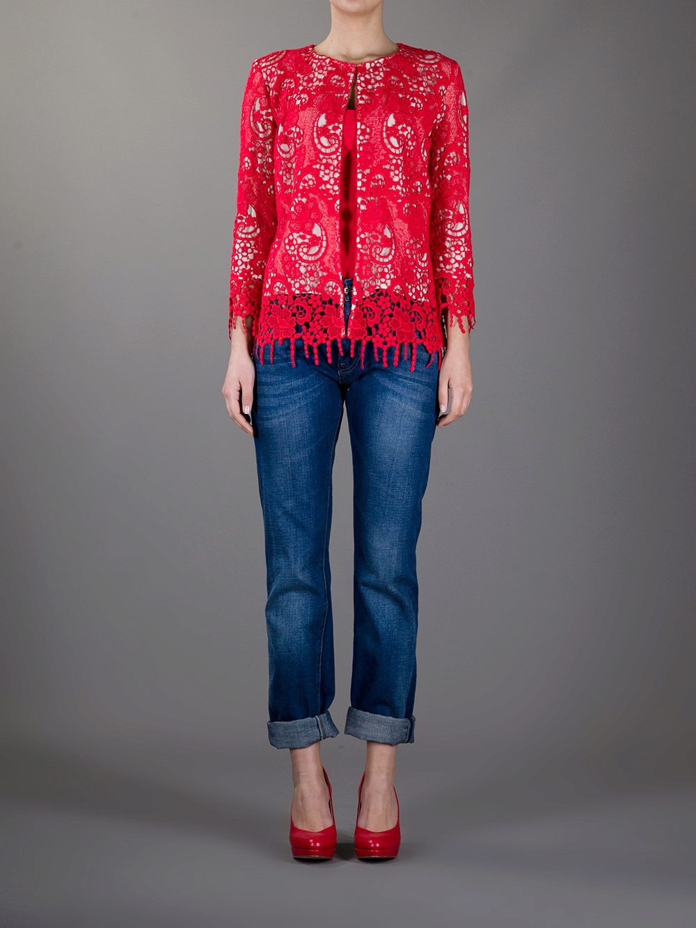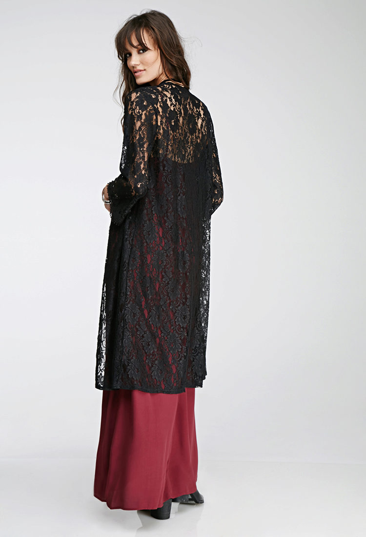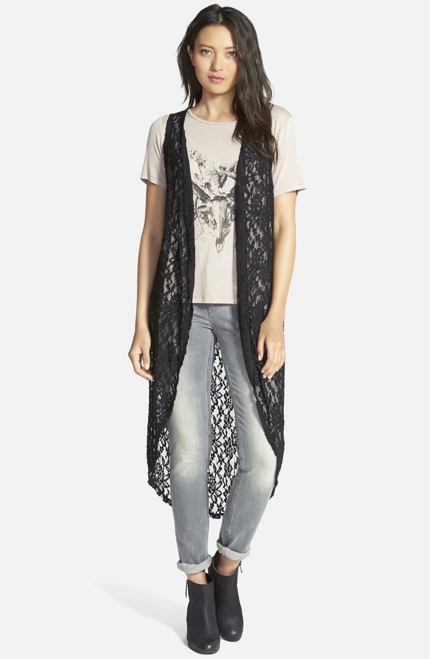 A classic mid-length cardigan made of thick lace can be worn with narrow, skinny jeans or pants.