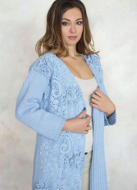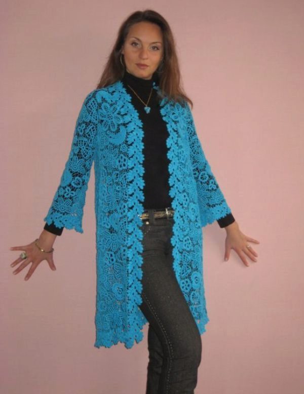 Irish lace cardigans are made in a single-color version or in a combination of several colors. For knitting, threads of different thickness are chosen; depending on this, the finished cardigan resembles either a light, openwork cobweb or a stylish knitted coat.