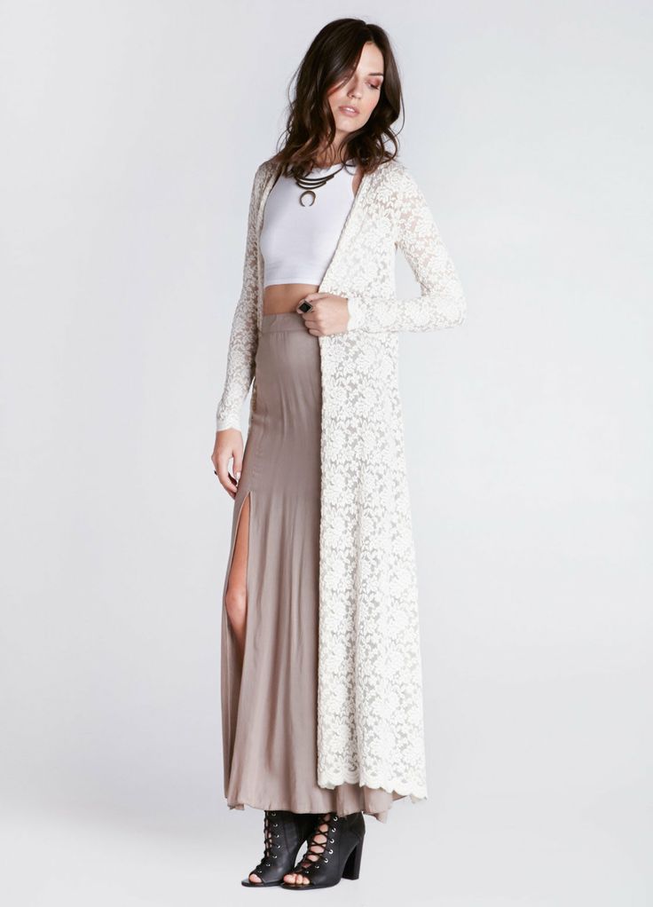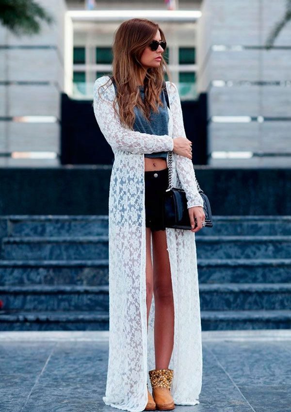 Long lace cardigans look great with skirts of the same length or slightly shorter. The graceful fitted models will make an excellent set with lush skirts, trapezes, sun, half sun, etc.
