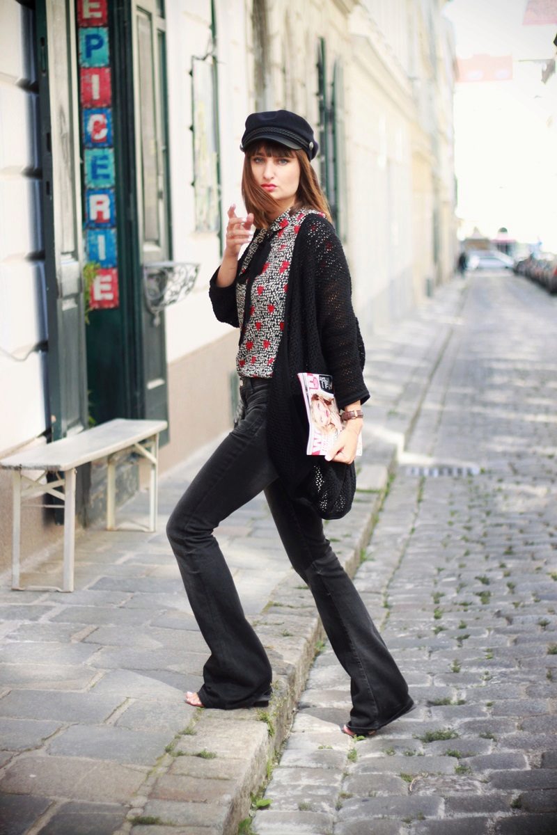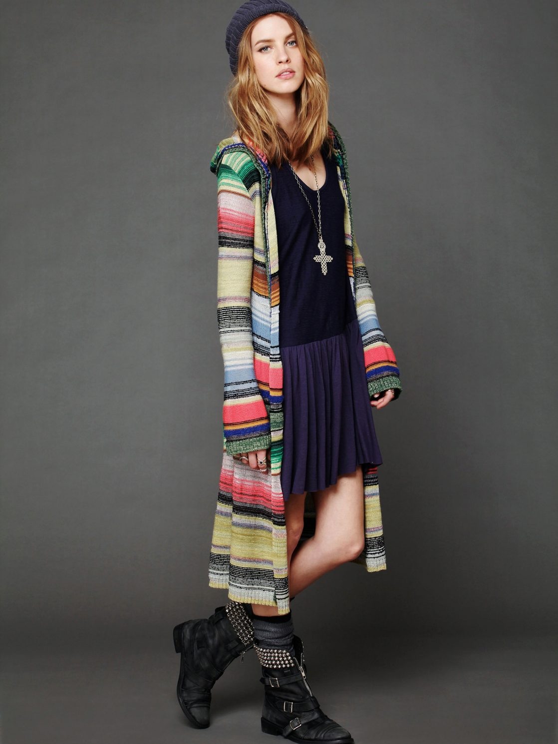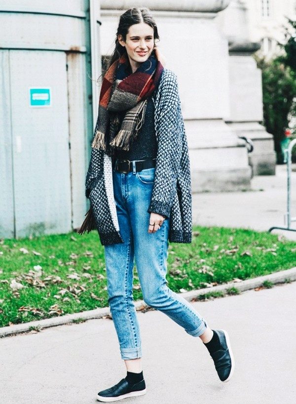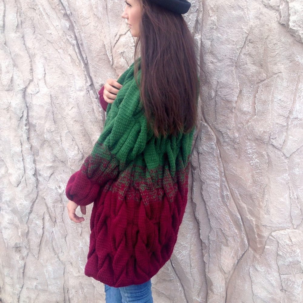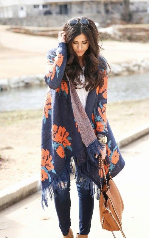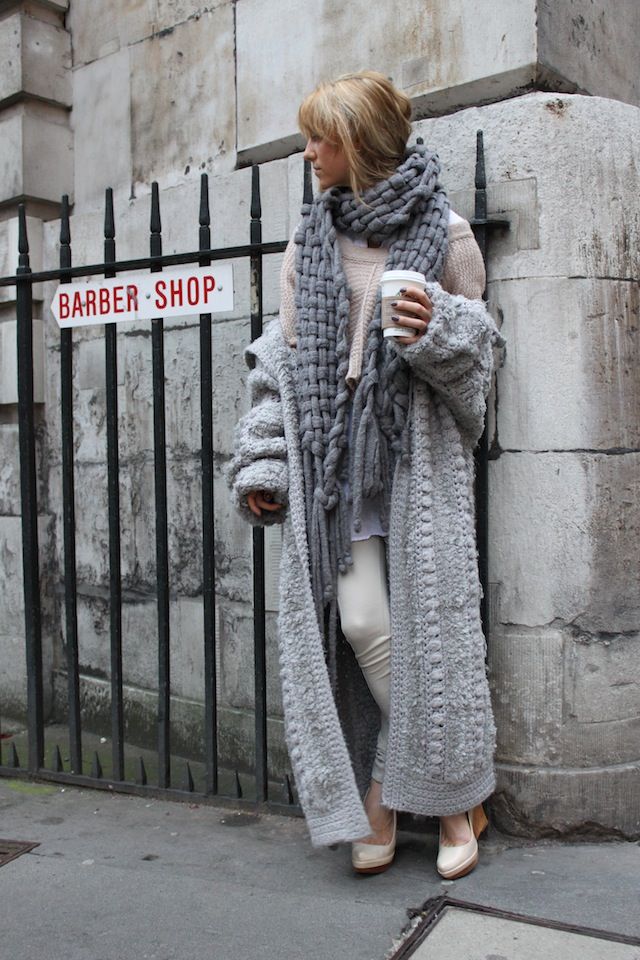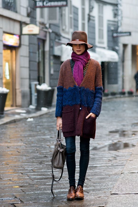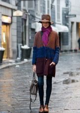 In the cold season it can be a knitted cardigan, preferably handmade. Volumetric coarse binding, mix of multi-colored yarn, “natural” natural shades are welcomed.