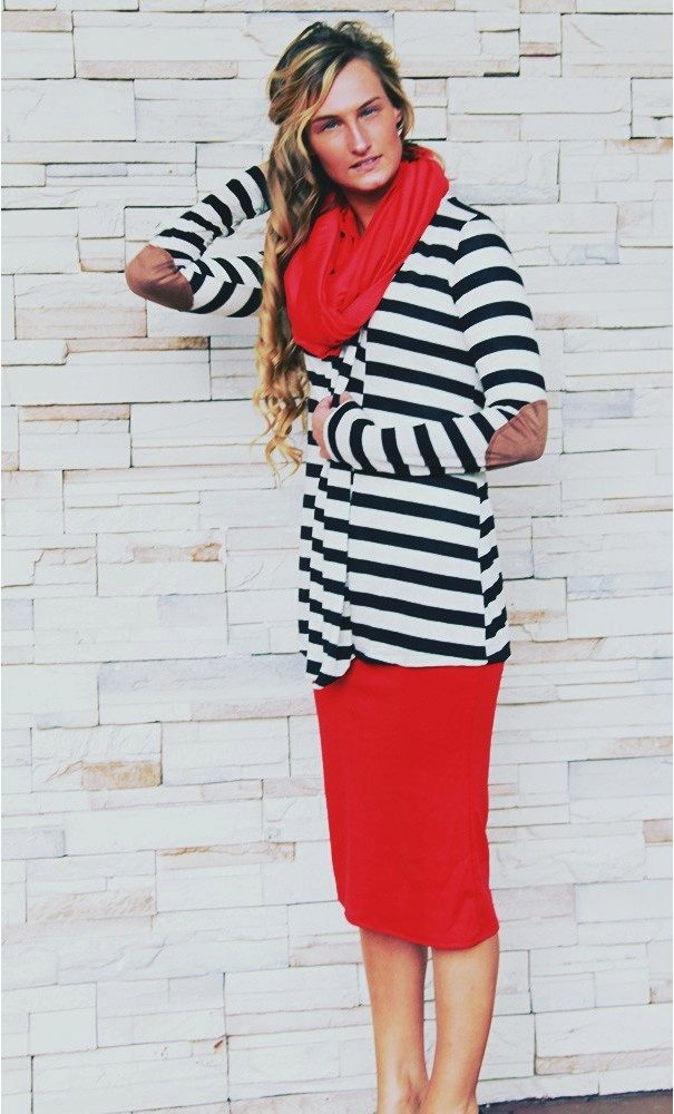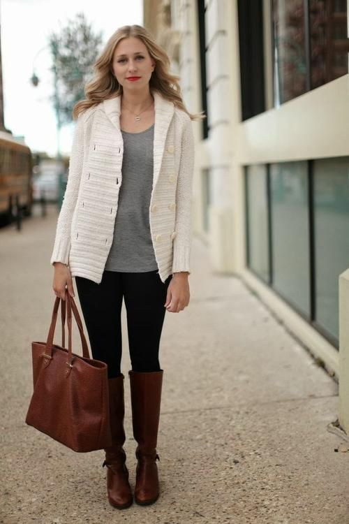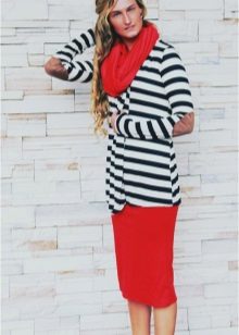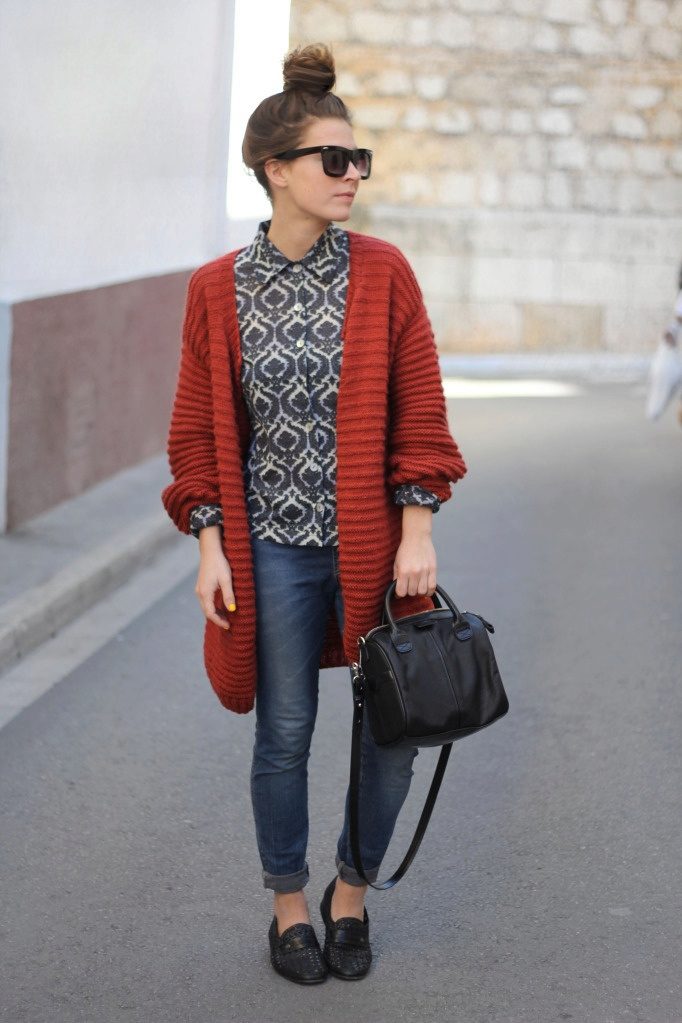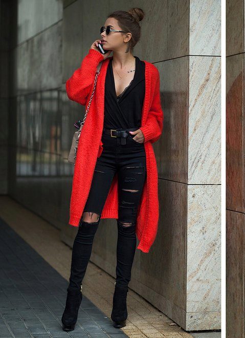 A red cardigan looks both comfortable and bold. If you wear it to work, combine with neutral colors. Naturally, the favorites will be black, white and gray.