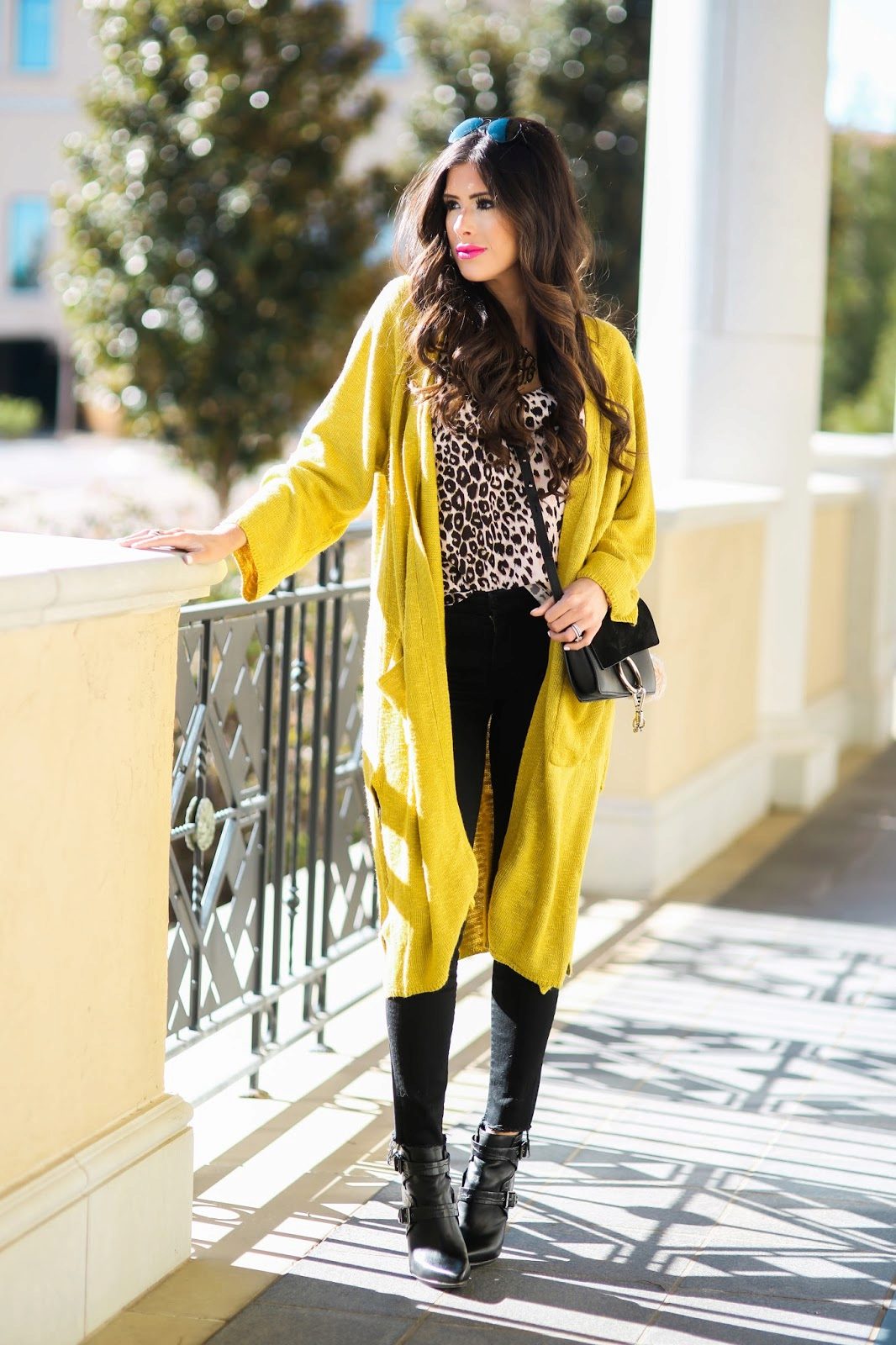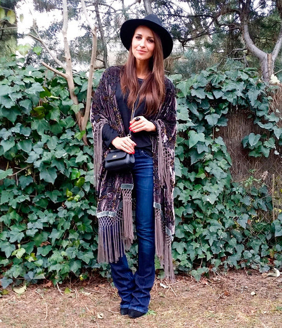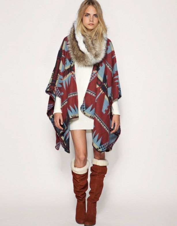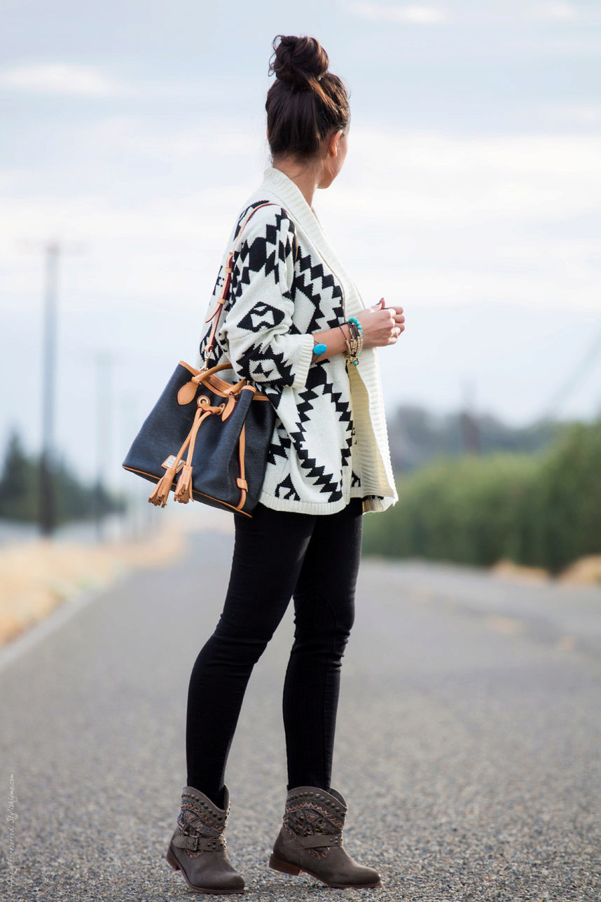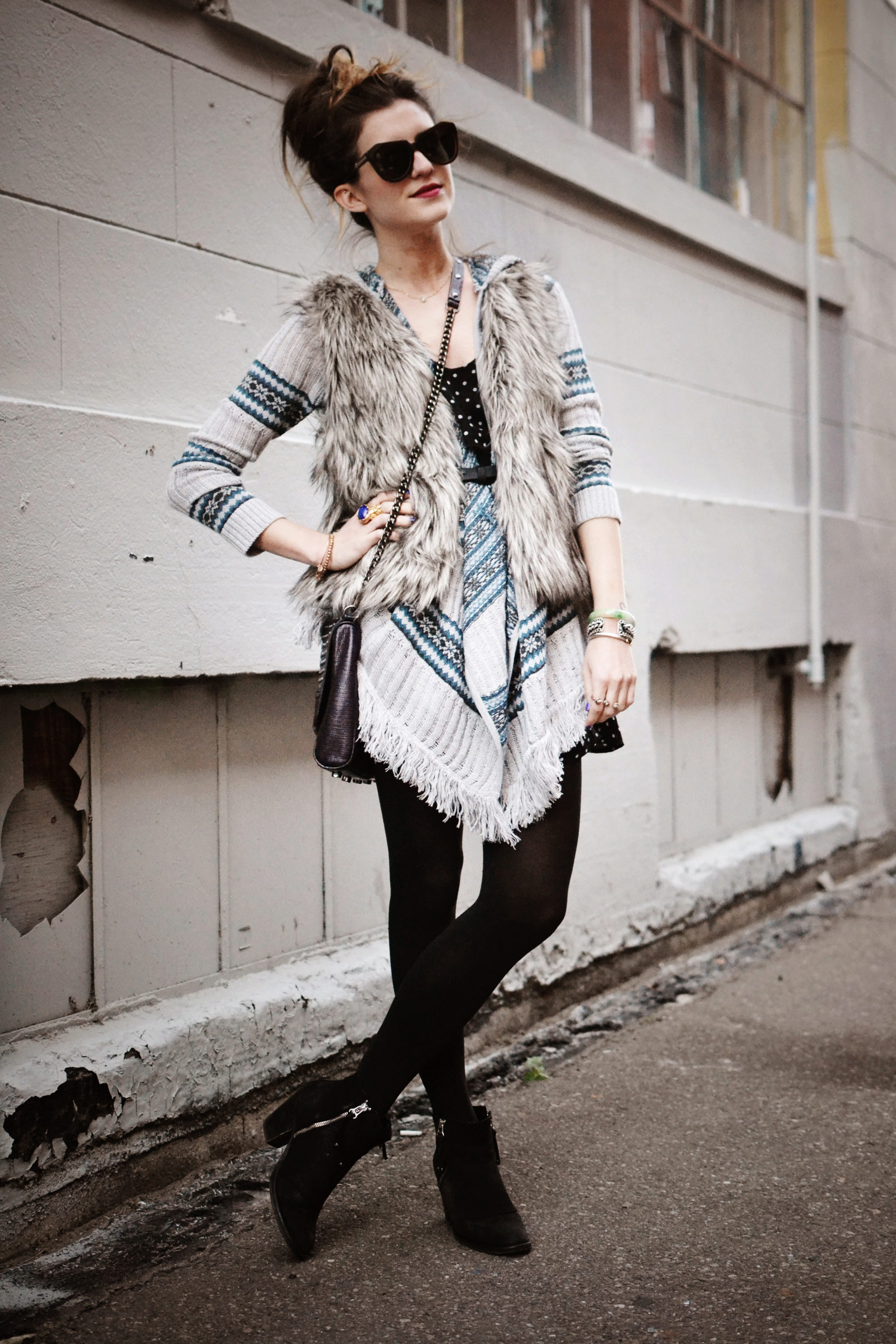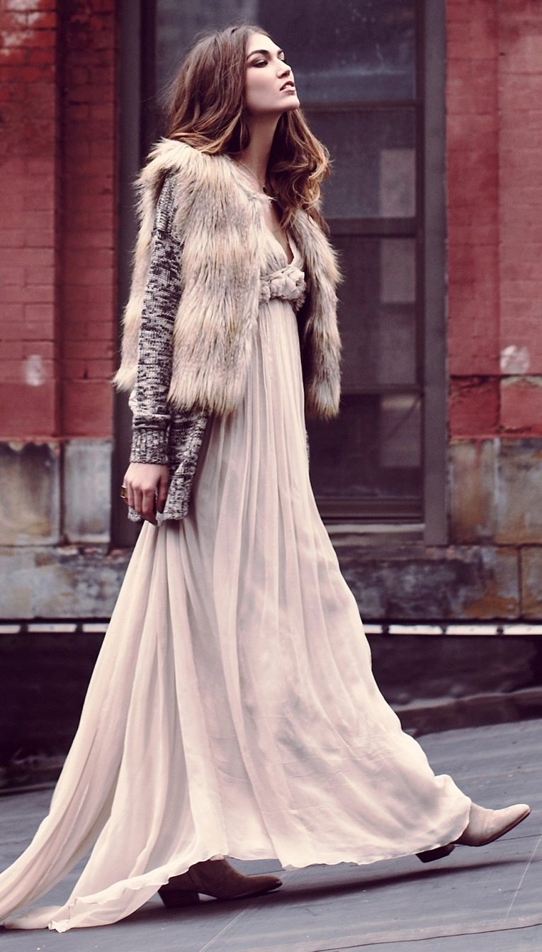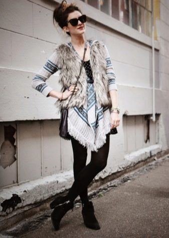 Since the boho style implies a multi-layered, the fur vest over the cardigan looks especially elegant.