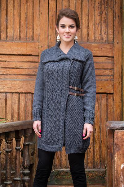 Asymmetric models are both short and long, dense and light, translucent and voluminous.. The standard length of an asymmetric cardigan ends in the knee area.