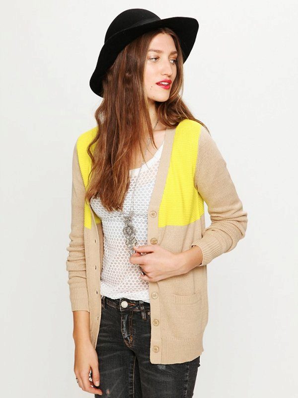 In fashion cardigans, made in the color block technique. Remember that this technique does not necessarily imply a combination of bright, screaming colors. It may well be calm colors, which will look good in a business style.For example, blue and white, beige and black will look inconspicuous, but original. Bright cardigans are suitable for everyday looks, when you definitely need to stand out or refresh your look.