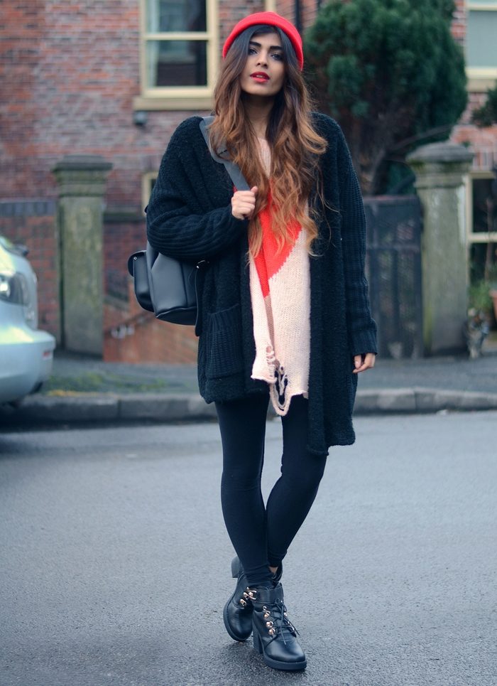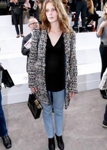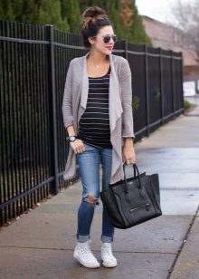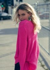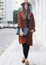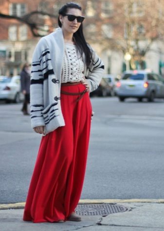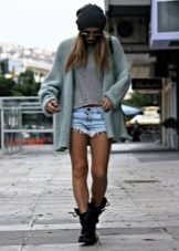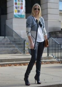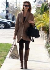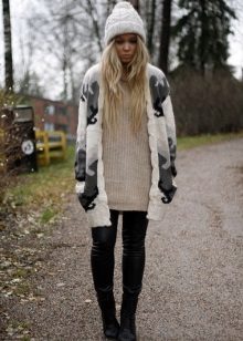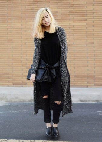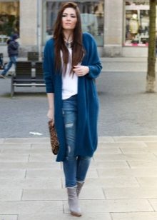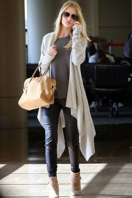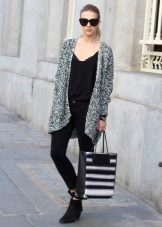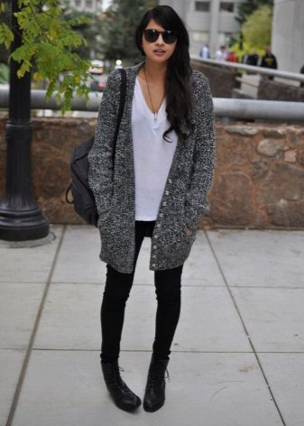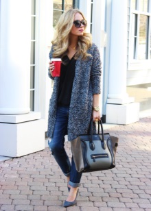 Clothes on top in a free style bow can be any - when choosing it first of all, you need to focus on the lower part of the ensemble. The main condition is that it should be as tight as possible so that it does not stand out from under the cardigan. Since it is warm and, accordingly, voluminous, an additional visible layer of clothing will visually add a few extra pounds to your image.