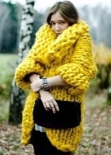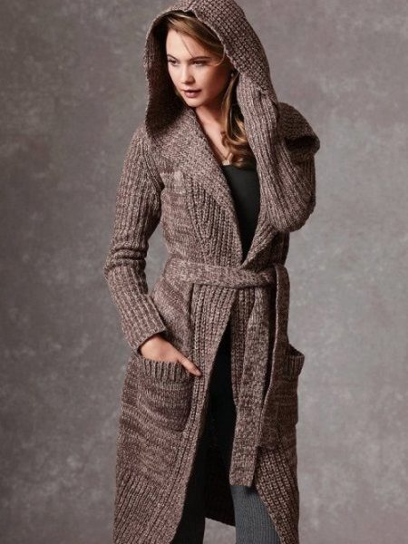 An interesting model of a cardigan with a smell - as a rule, it is made of coarse-knit wool. There is no clasp on it, only a belt is provided, which acts both as a belt and as a decorative element.