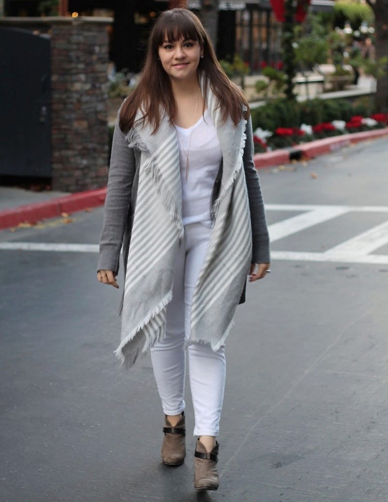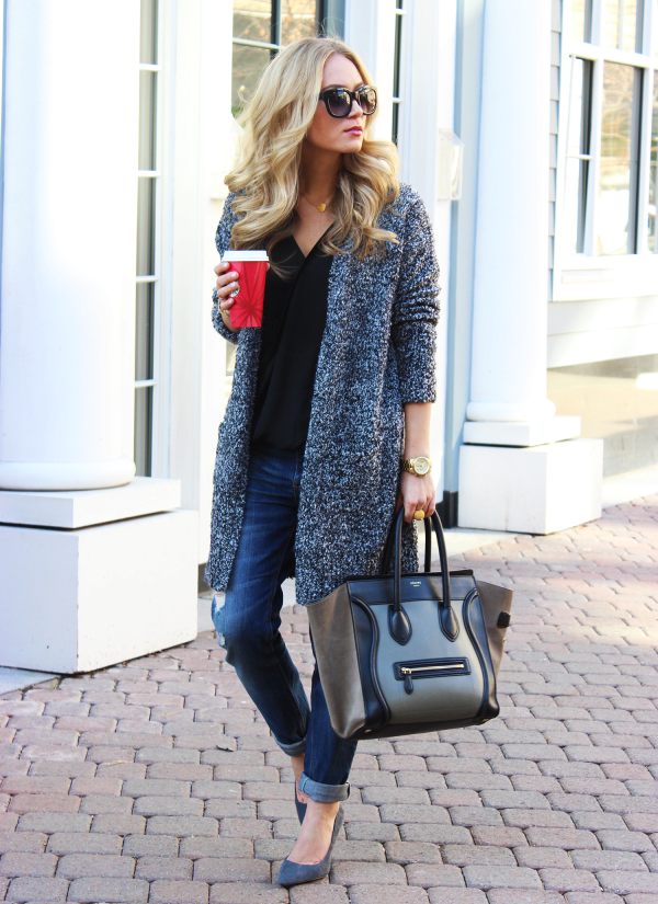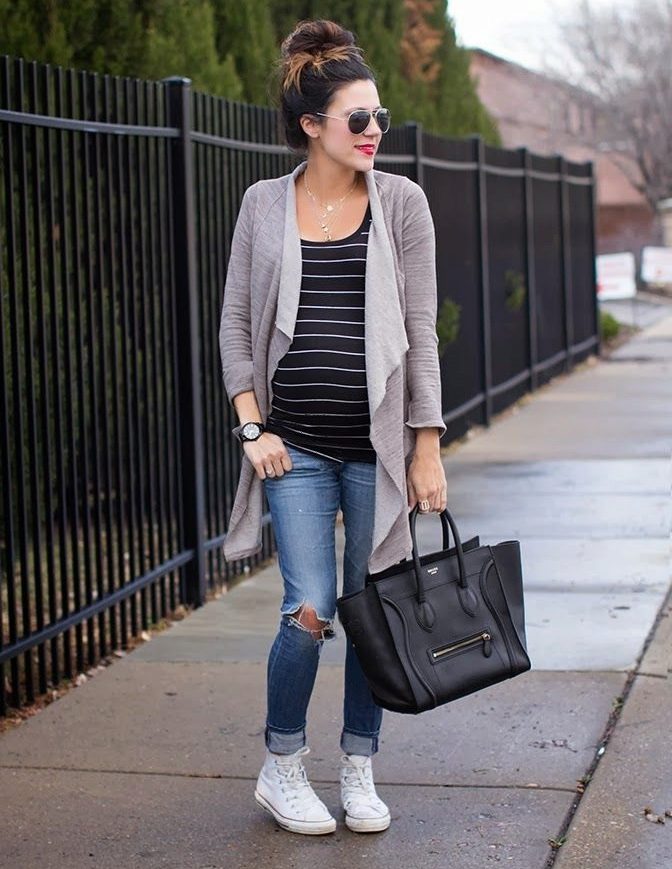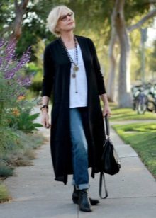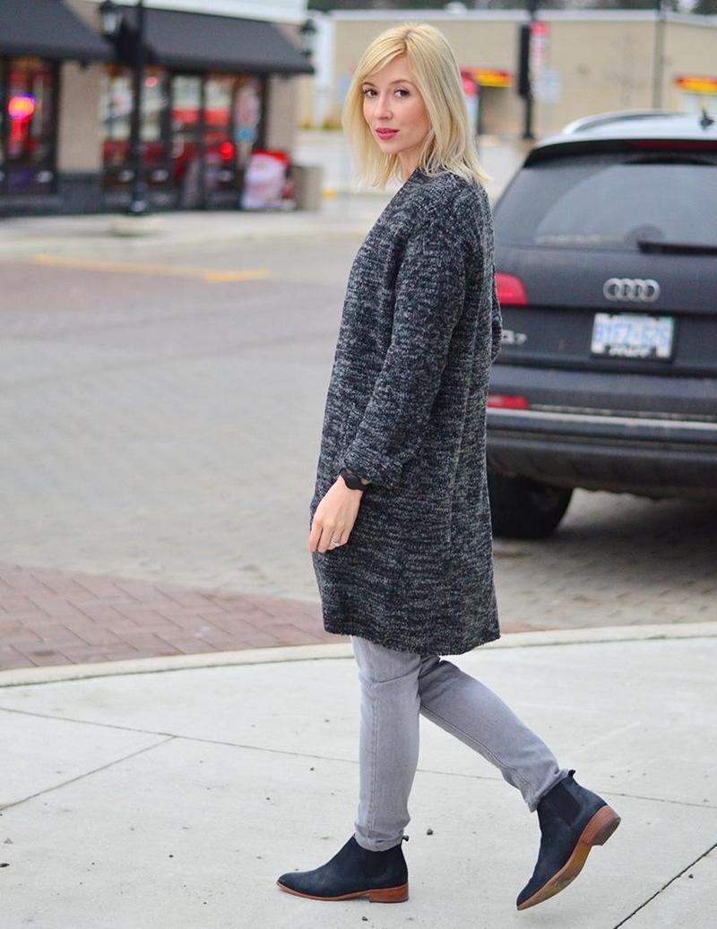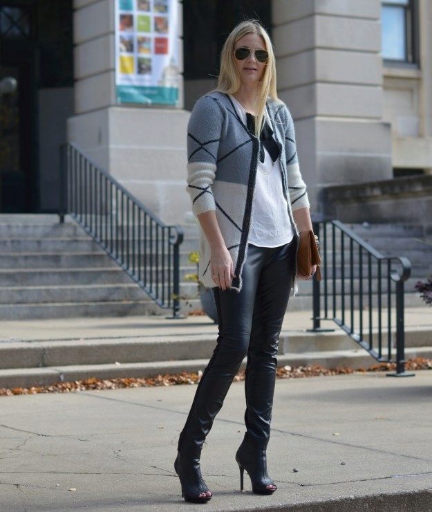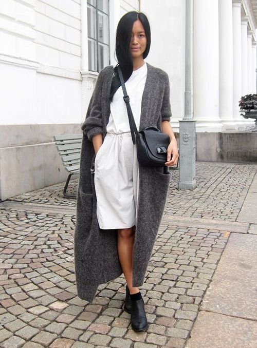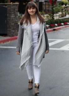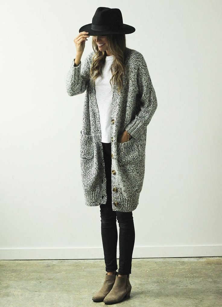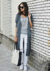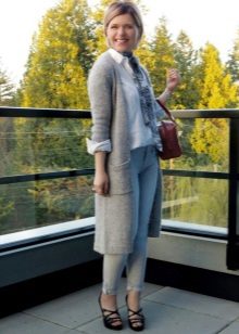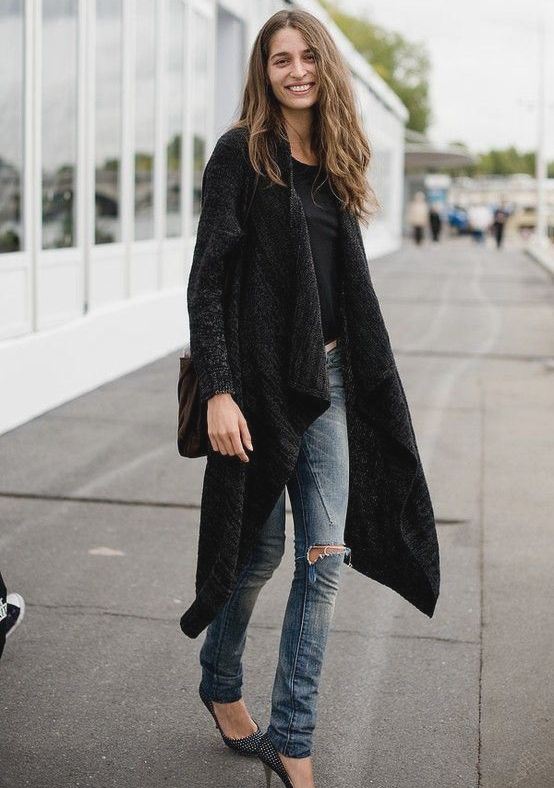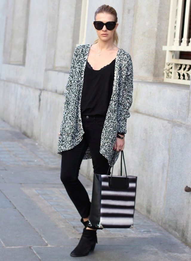 A warm cardigan would be an excellent option for visiting the office or a business lunch. Its color should be neutral - black, gray or white. The rest of the ensemble should follow the usual business style - black bottom (for example, skinny trousers, black jeans of classic cut or pencil skirt) and white or light top - white blouse, light top or thin jumper.