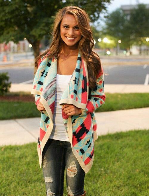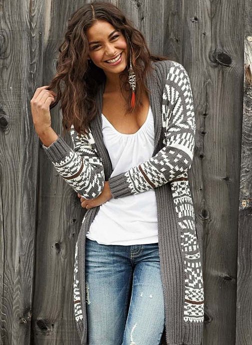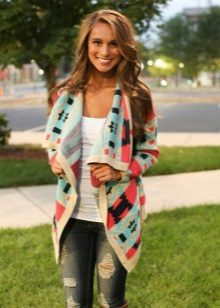The use of different prints is very popular on warm fabric cardigans - these can be simple lines and complex geometric shapes. The prints of ethnic themes are also relevant - static color images look very relevant on drape models.Knitted cardigans are often decorated with “winter” patterns - deer, snowflakes, patterns, and the like.