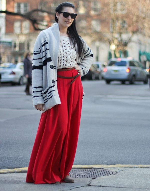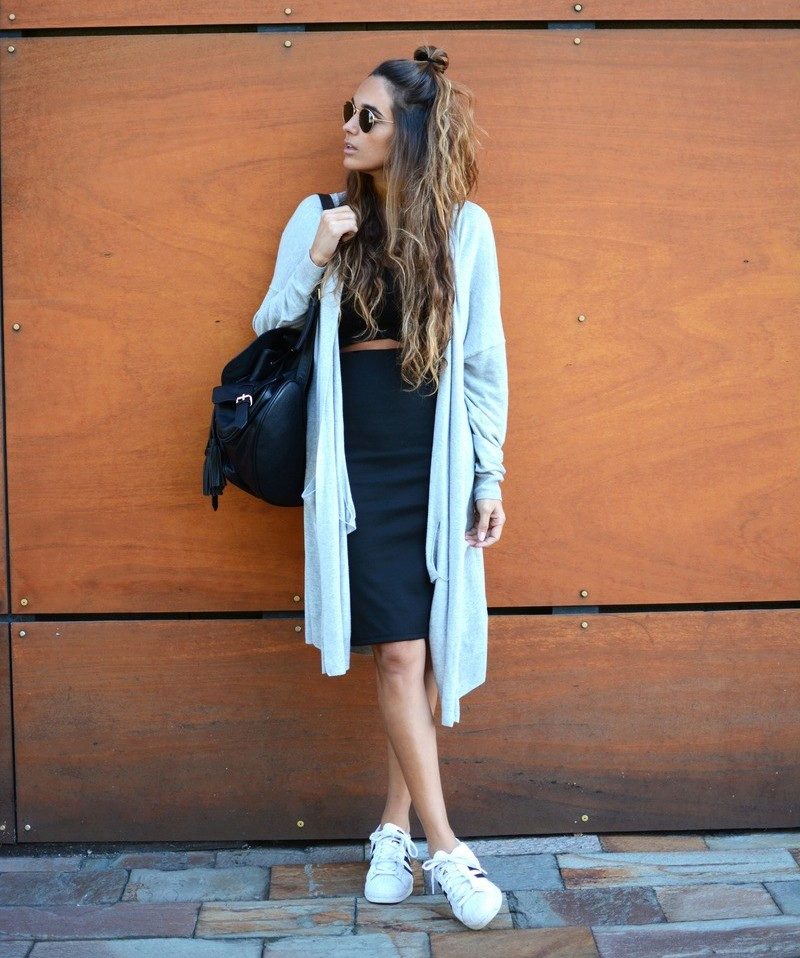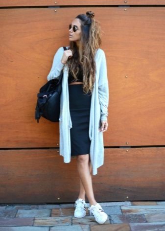 If you want to wear a cardigan in combination with a skirt, then the latter should be chosen either straight or narrowed cut, since you can create a little “gypsy” look. The combination of a cardigan and a skirt to the floor looks very tender and feminine. But the skirt should be monophonic and strictly straight cut, otherwise your image will seem a little wider than it actually is.