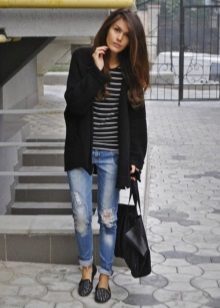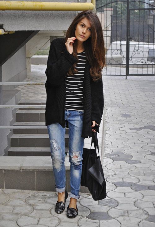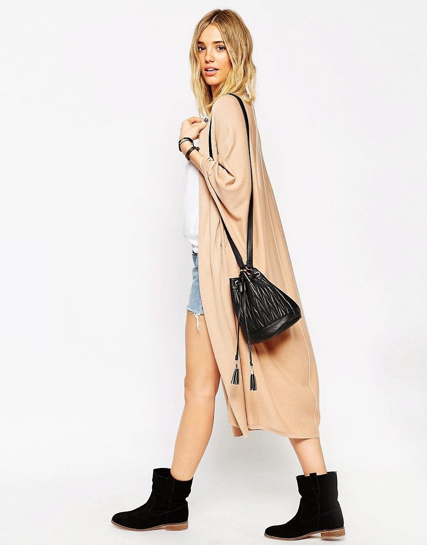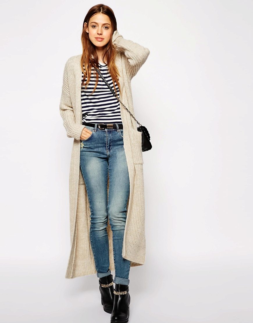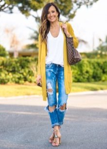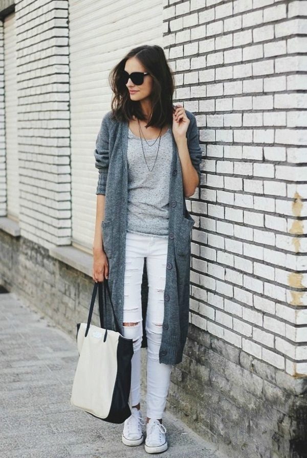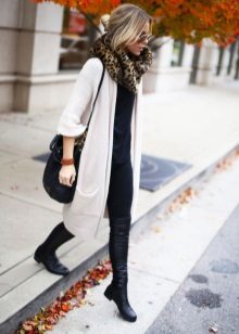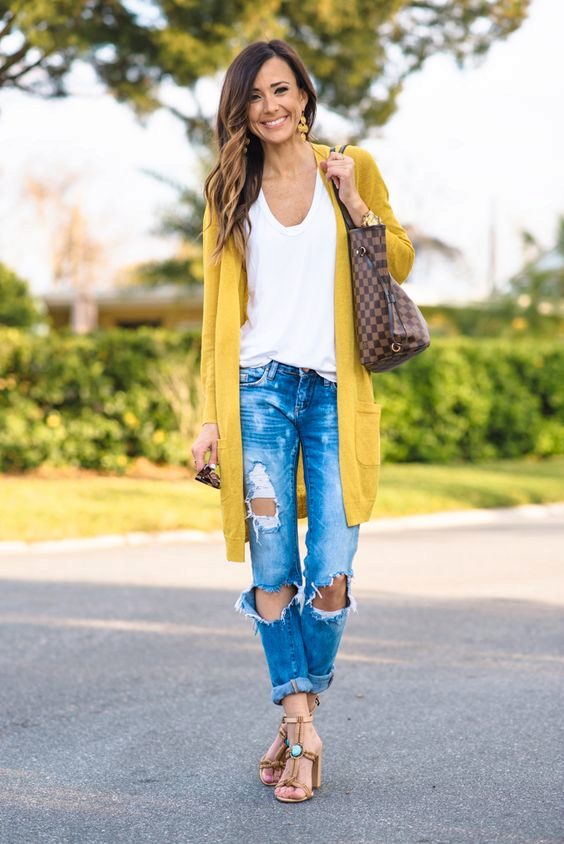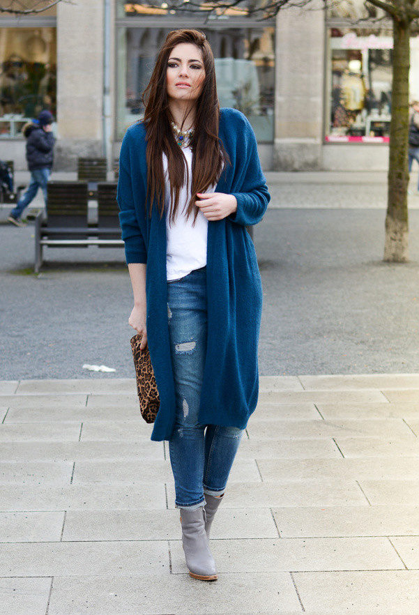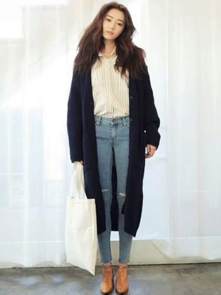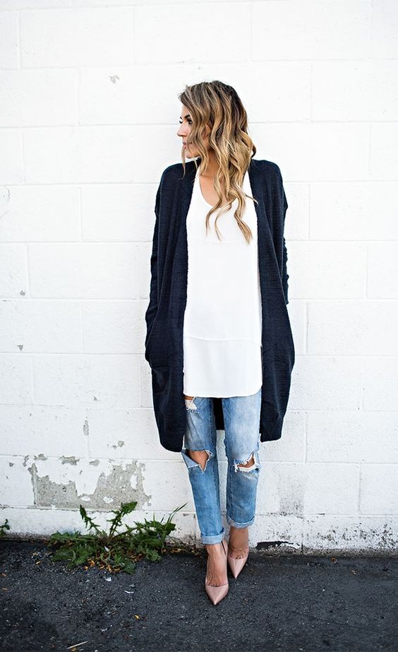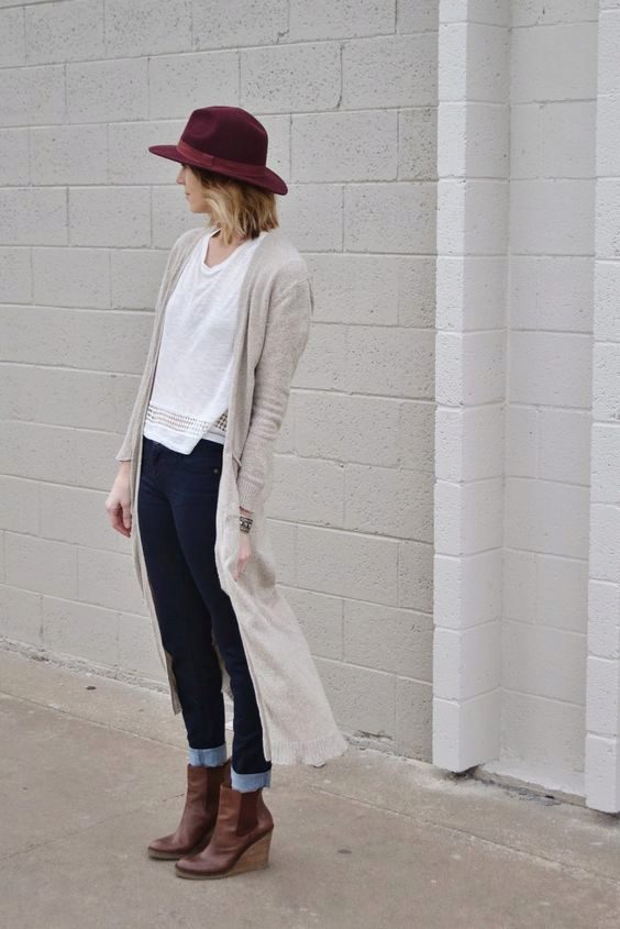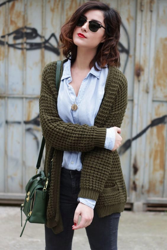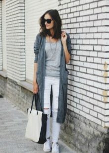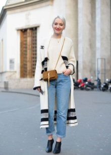 Bag and shoes can be selected according to your chosen style. Modern fashion allows cardigans to be combined with almost any shoe, with or without a heel. The best option is shoes or ankle boots with a small heel that are suitable for any occasion..