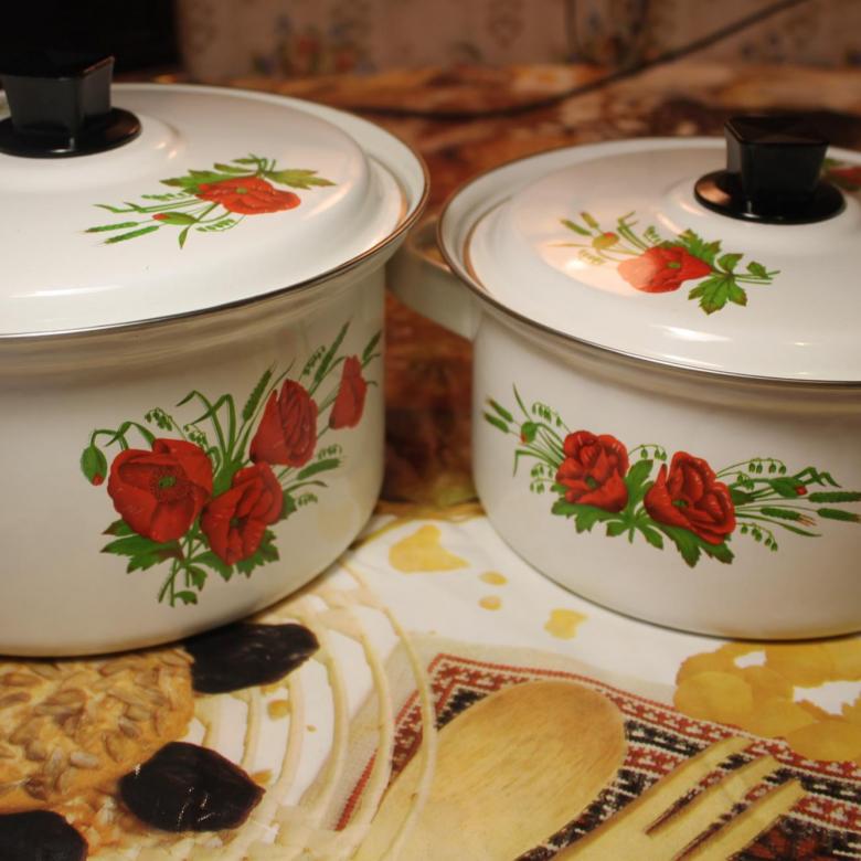 In addition to the obvious advantages of such pans, there are a number of disadvantages. After blows and falls, the enamel is quickly damaged.. Rust is easily formed on the resulting spall, pathogens accumulate. Also in enamelware dairy products burn easily, even if they are constantly stirred.