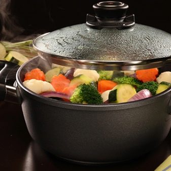 The product from aluminum with a special non-stick coating is very popular on the market. This model heats up quickly and uniformly, keeps the heat for a long time, and is useful for dishes that require prolonged stewing. Aluminum coated dishes can be washed in the dishwasher, but with the observance of the temperature of the water. It should not be higher than + 50 ° C, and cleaning products should be chosen without alkali.