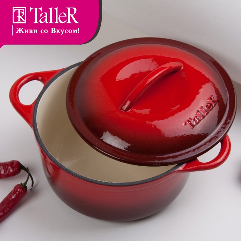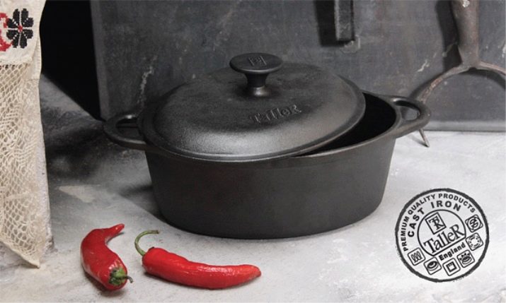 About pans company TalleR have different reviews. A lot of positive characteristics, however, some buyers are unhappy with the purchase. In general, negative reviews are written by those who are negligent in complying with the instructions. It is also worth noting that the model is quite expensive, and is not available to everyone. The minus, except for the price, is that you can not salt the dishes at the beginning of cooking. A rust layer from cast-iron cookware is classified as a defect. And enameled utensils made of cast iron do not suffer from blows or falls. This leads to chips on the coating, and it is not recommended to use such dishes for cooking, because the chips soon rust and pieces of the coating get into the food.