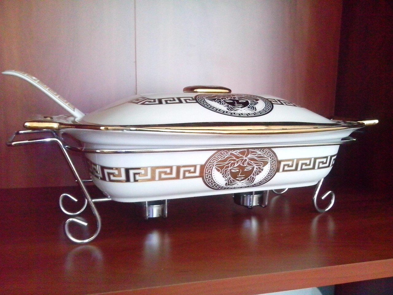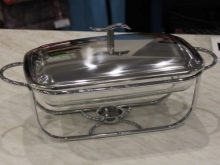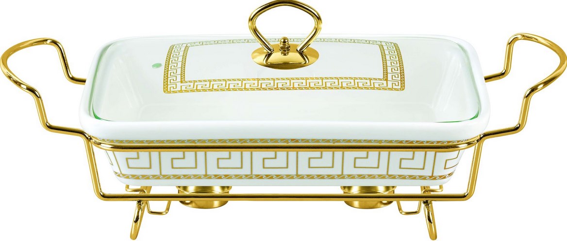 Model brand Mercury. The household rectangular food warmer is a ceramic container for food with convenient handles on a metal stand. Ceramic lid tightly closes the pan. Marmitnitsa itself can be used in the microwave and oven for baking dishes.
