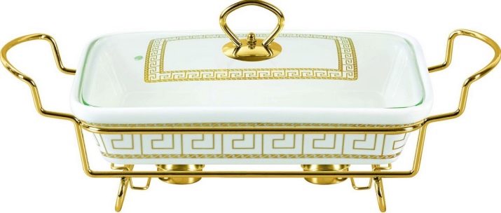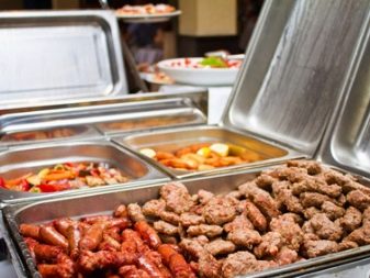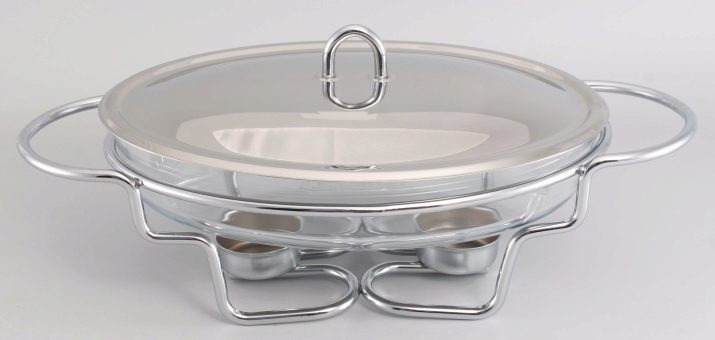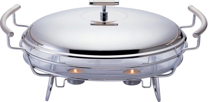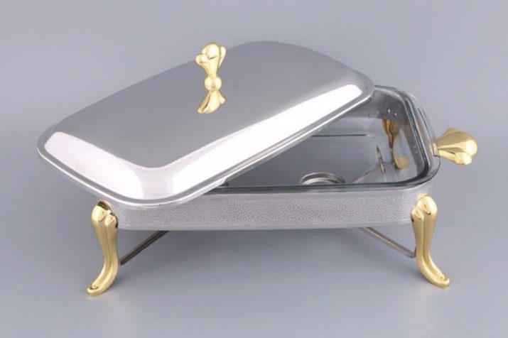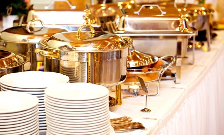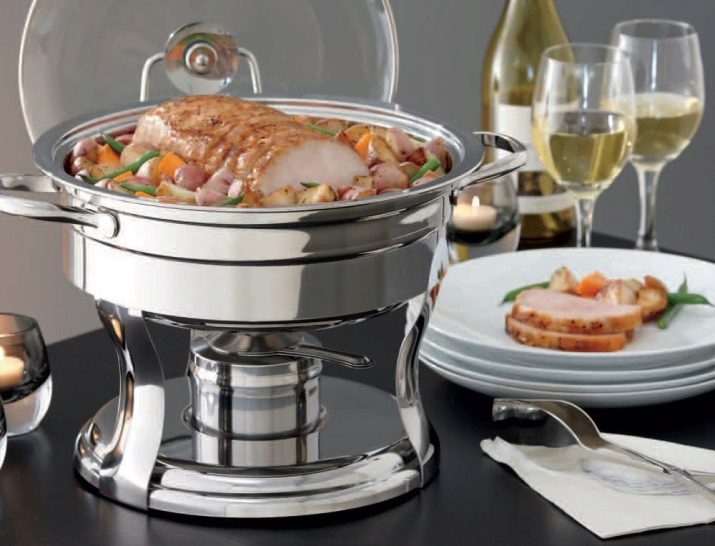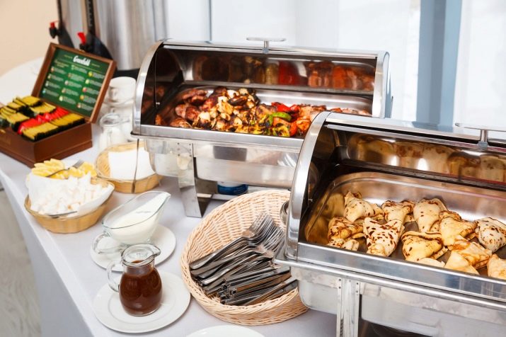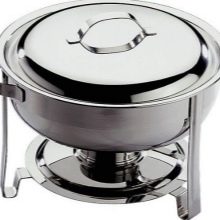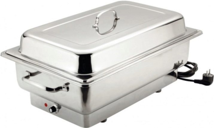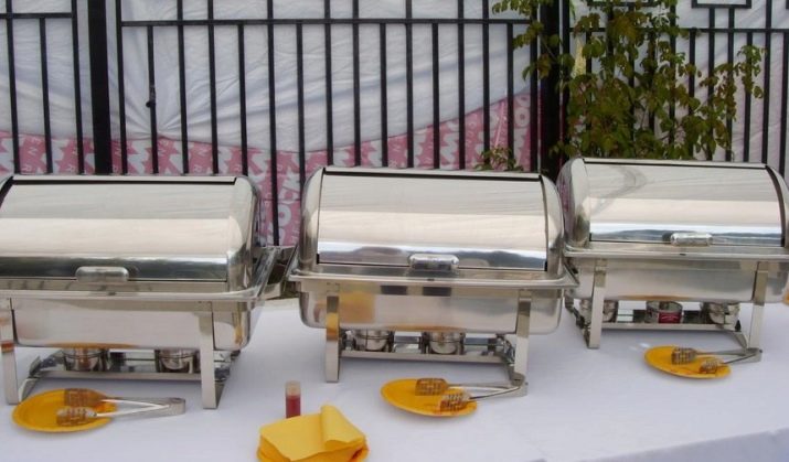 There is another specific type of food warmers for serving banquets with buffets and buffets - this is chafindish.By design features, it refers to the desktop view and is designed for main dishes, drinks and baking. The modular design of Chafindish allows the use of both one and several food containers. These food warmers have a rectangular shape, removable food blocks of three standard volumes: 1, 2 and 3 liters. Heated food in them is carried out with water vapor.