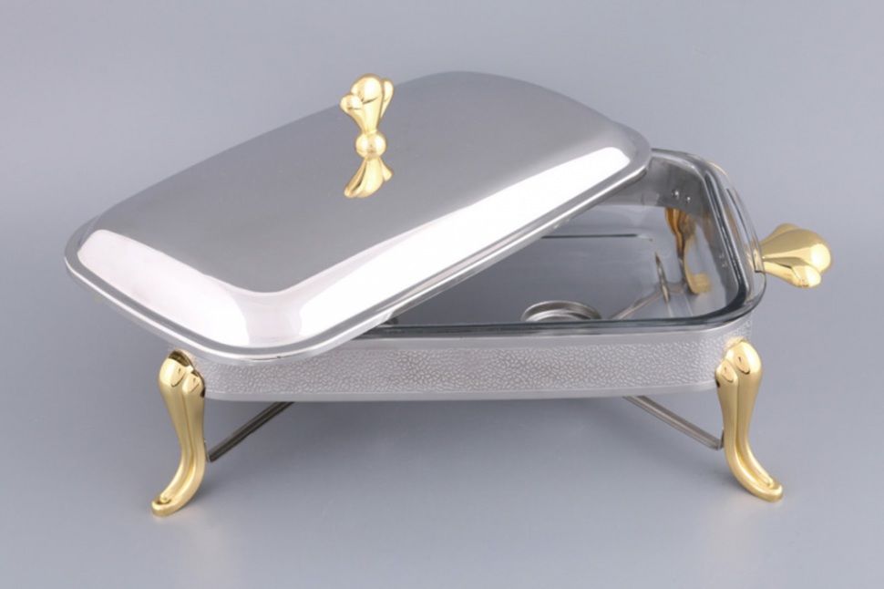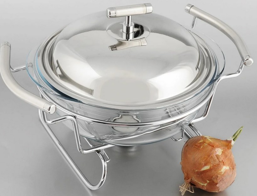 Table-type steam dishes for second courses are a design of a food container with a lid on a stand with a heating device.