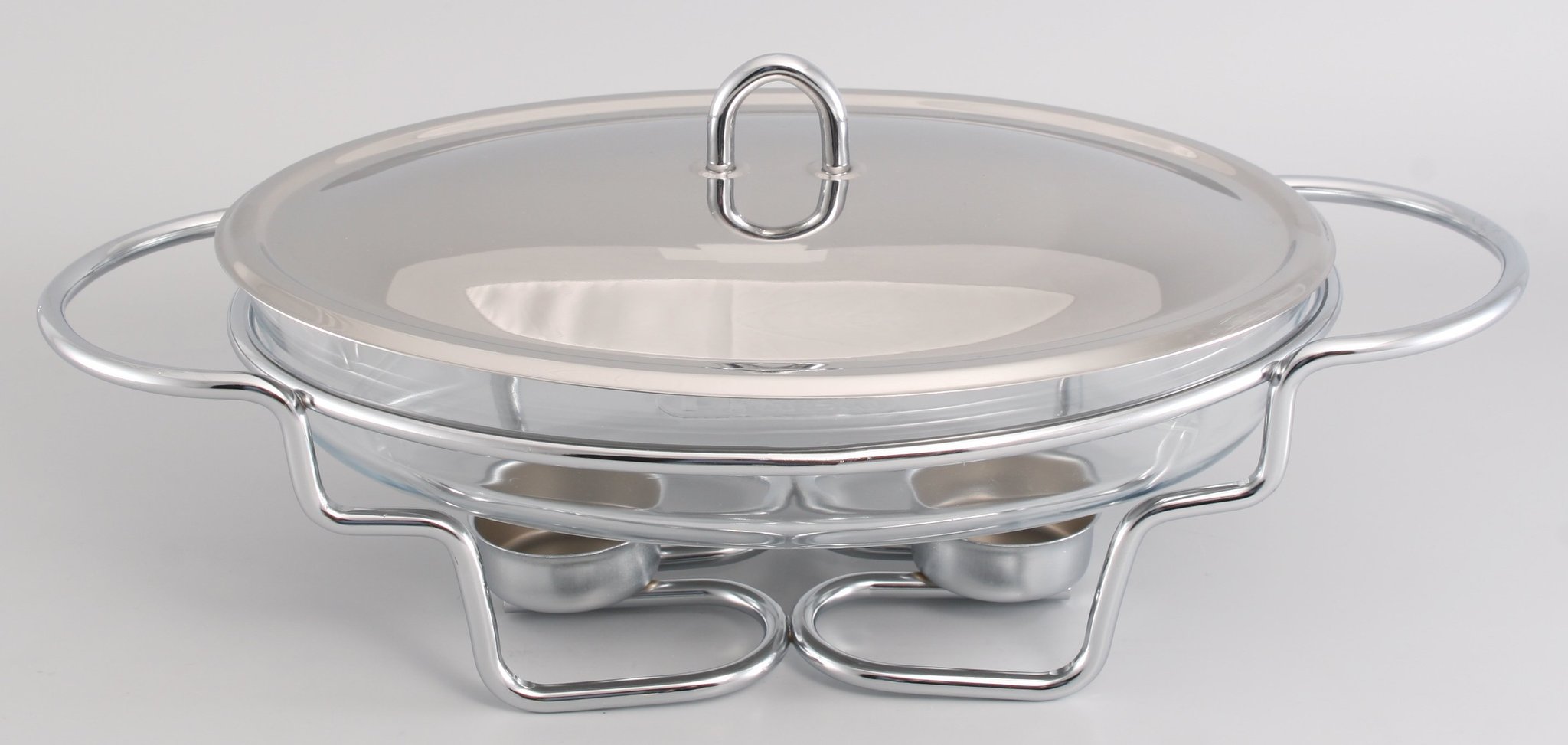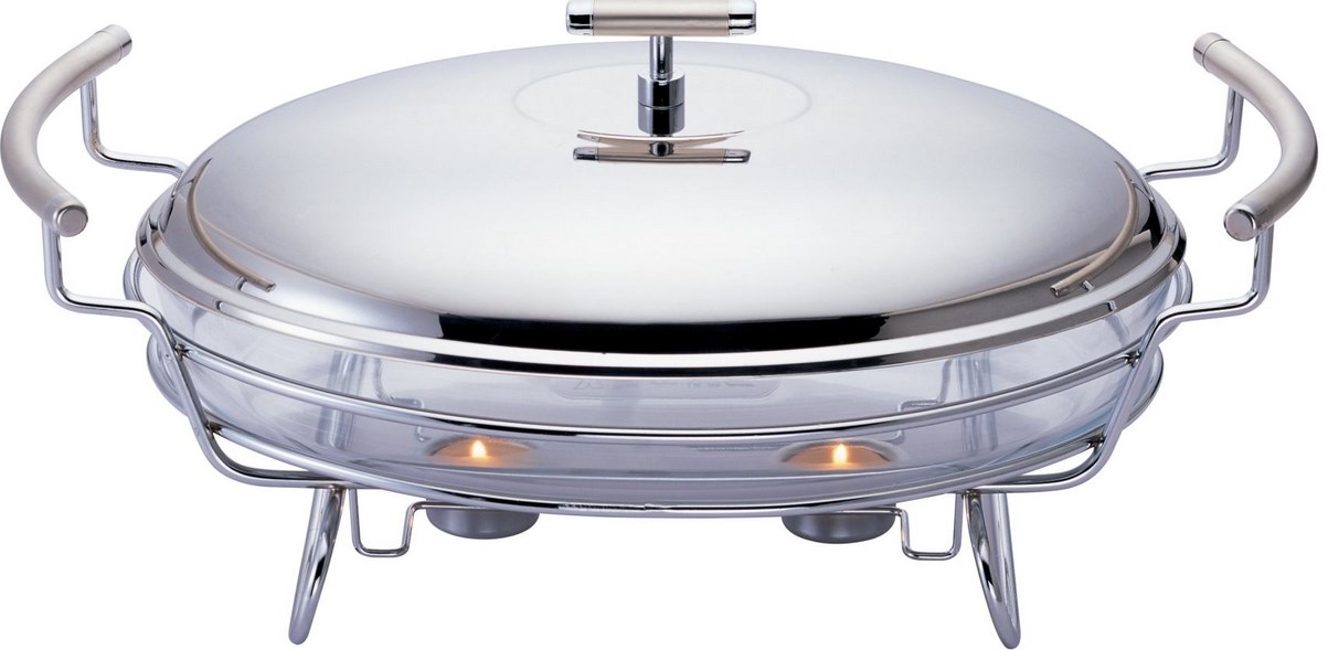 Gipfel - this model of a household desktop portable marmite of an oval form from heat-resistant transparent glass is intended for first courses. Candles are used for heating. The stand and the cover are made of chrome steel with a mirror surface.