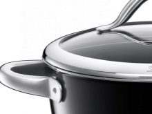 Pots with an interesting design and high performance are presented in different volumes from 2 to 6 liters. The cookware is made of high quality stainless steel, has a sparkling case and a transparent lid with a hole for steam. The double bottom technology allows you to quickly and evenly heat the dishes. Ergonomic handles do not heat up.