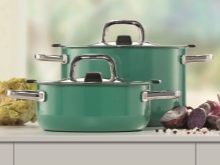 This line has a wide functionality and interesting design. The bright shade of the dishes will lift your spirits and fill the kitchen with color. The series includes pots from 2 to 6.5 liters.Each device has a strongly elongated core of steel, the inner coating of a dark color has anti-burn properties, which contributes to easier and more beneficial cooking without the use of large amounts of oil.